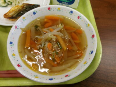 今日の給食は、ご飯、牛乳、さばの塩焼き、とり肉と野菜のマヨネーズ和え、沢煮椀でした。
