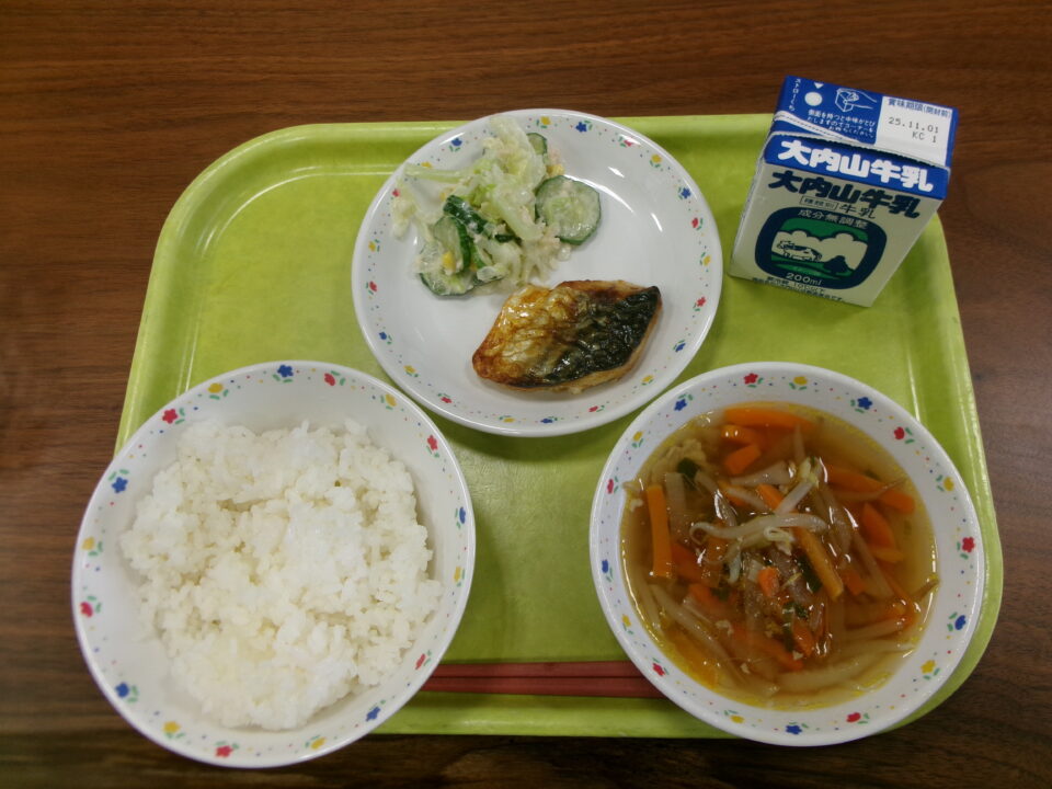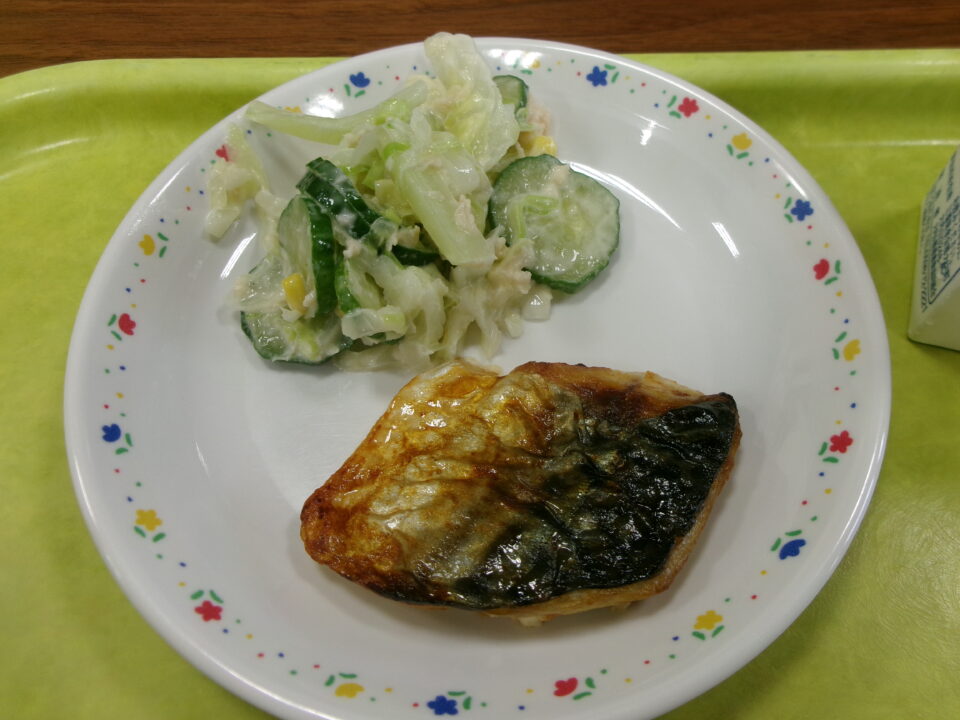 今日の給食は、ご飯、牛乳、さばの塩焼き、とり肉と野菜のマヨネーズ和え、沢煮椀でした。