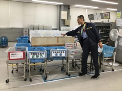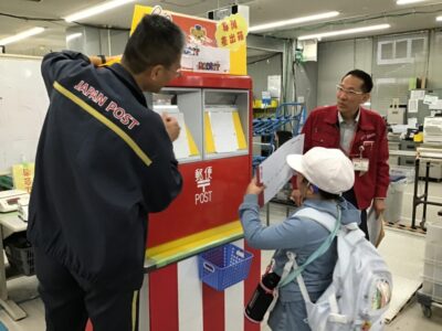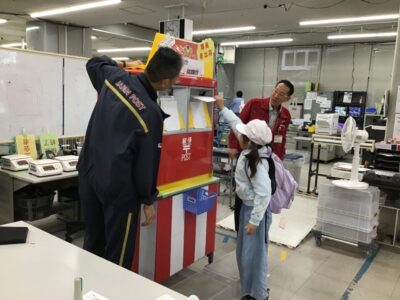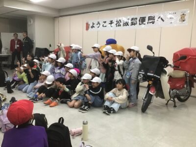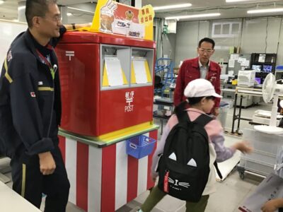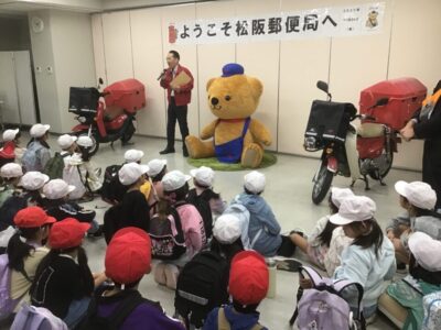 まず、松阪郵便局まつさかゆうびんきょく見学けんがくきました。松阪郵便局まつさかゆうびんきょくさんでは、おはなしかせていただきましたし、記念撮影きねんさつえいもさせていただきました。