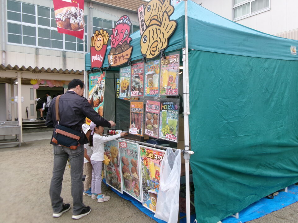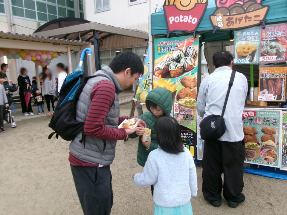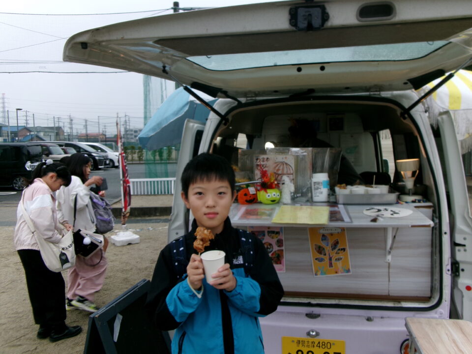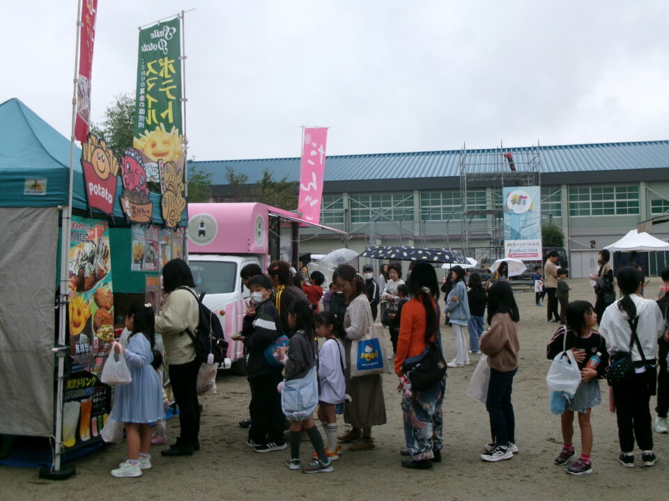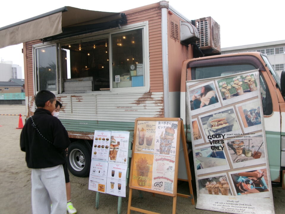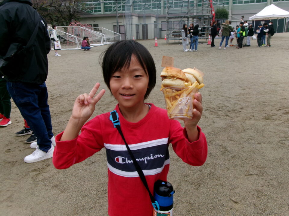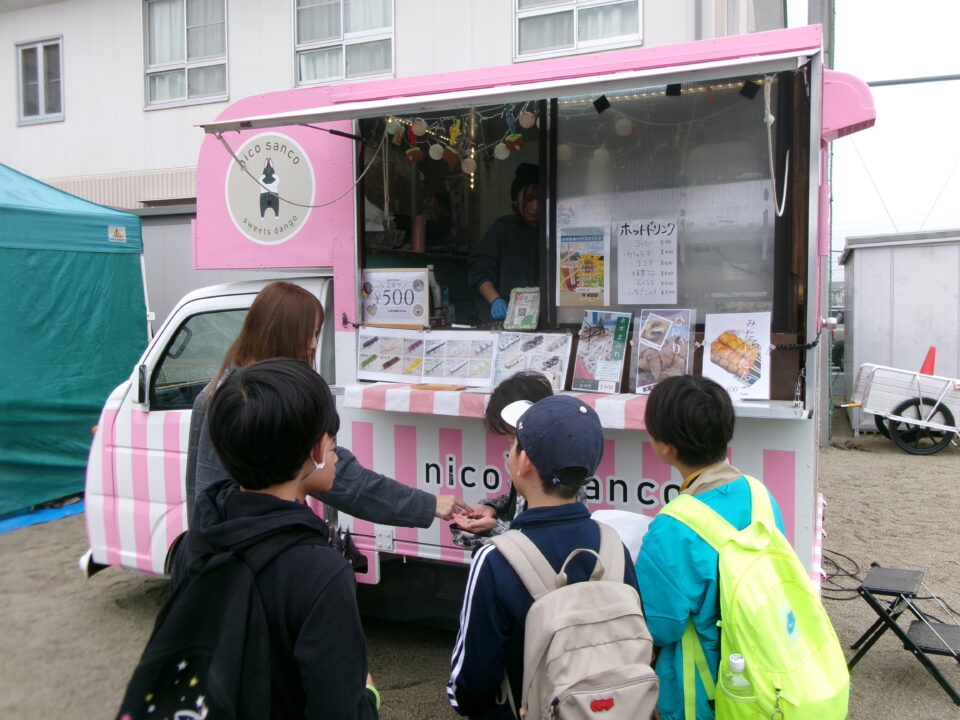 運動場では、キッチンカーが並び、からあげ、ハンバーガー、おだんご、ポテト、あげたこ、ドリンク、パンなどなどたくさんのおいしそうな食べ物や飲み物が登場!どれにしようか迷いましたね。