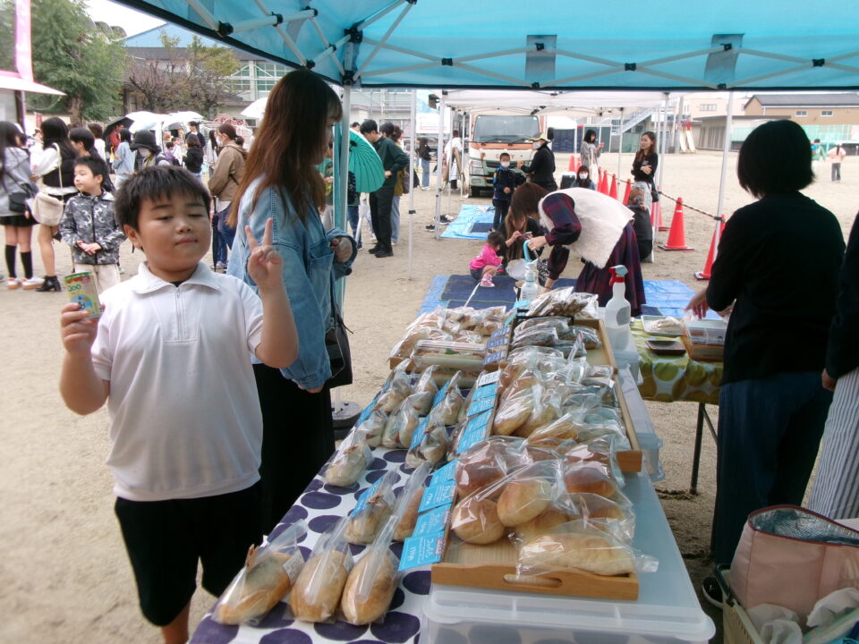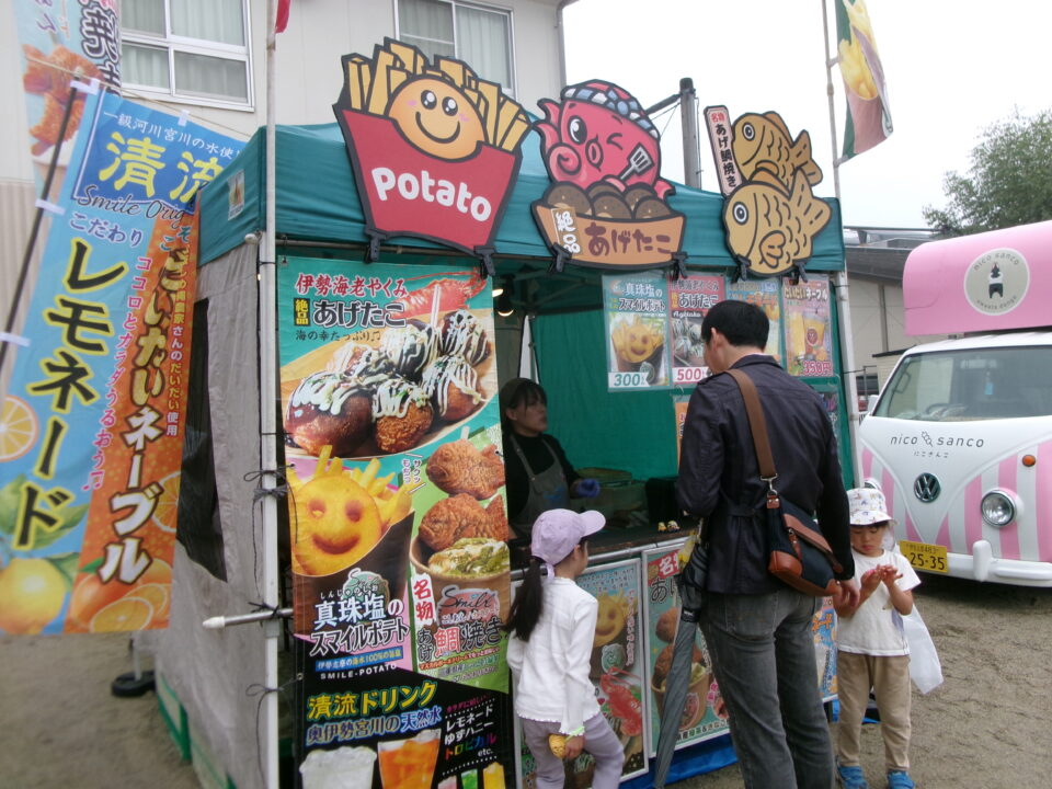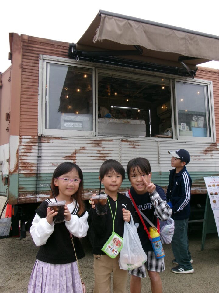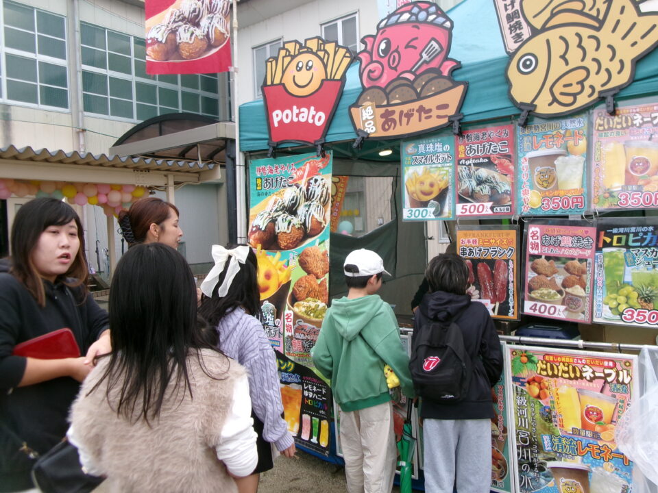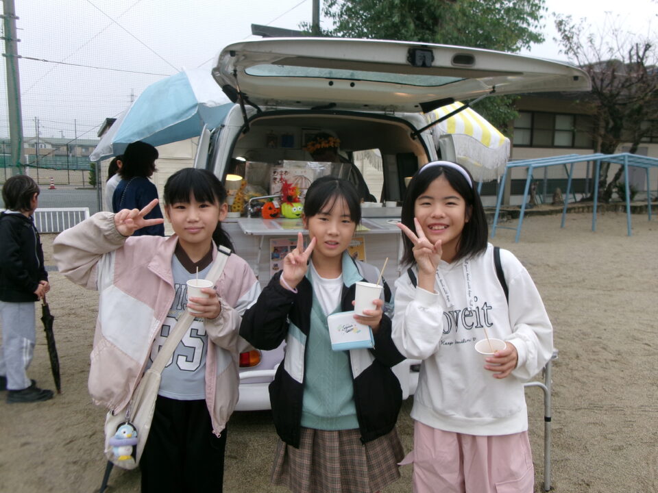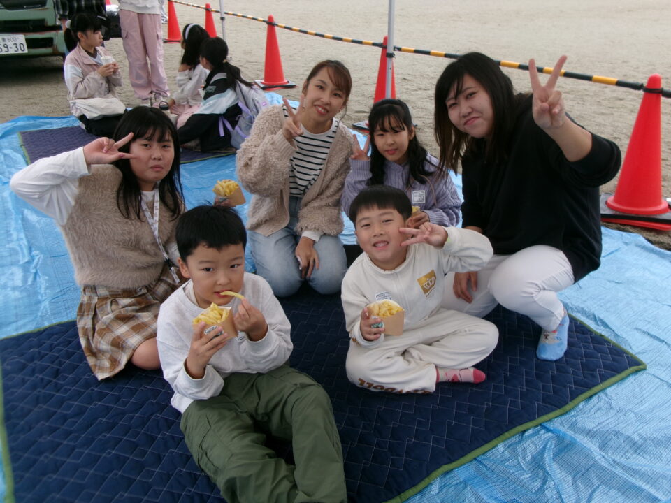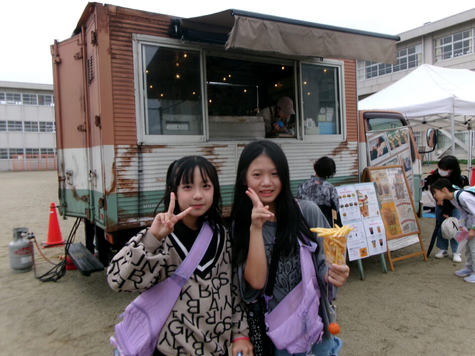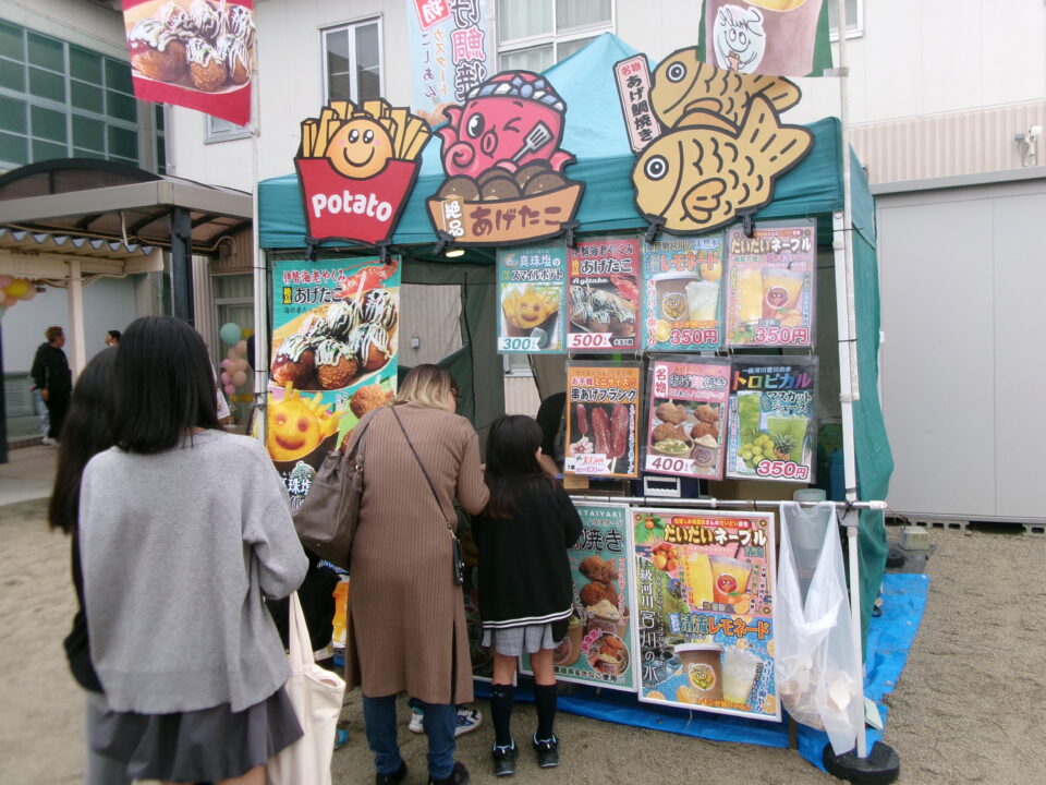 運動場では、キッチンカーが並び、からあげ、ハンバーガー、おだんご、ポテト、あげたこ、ドリンク、パンなどなどたくさんのおいしそうな食べ物や飲み物が登場!どれにしようか迷いましたね。