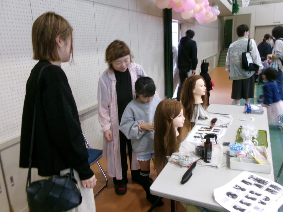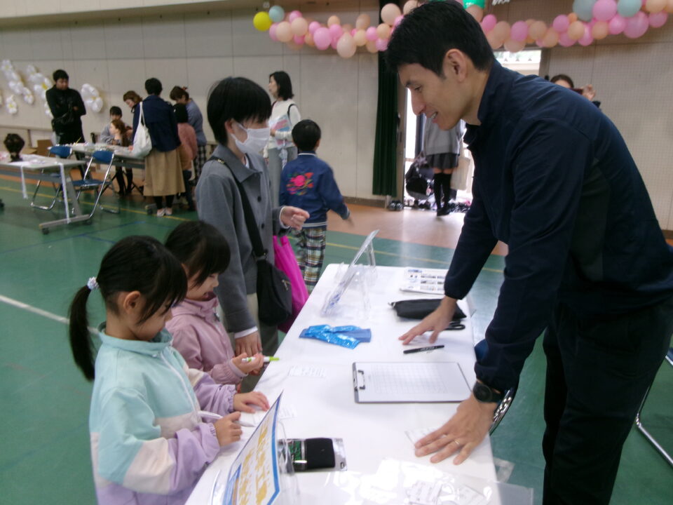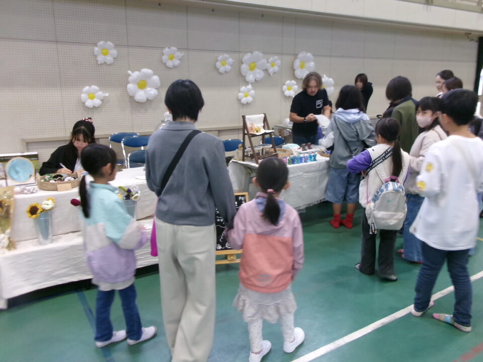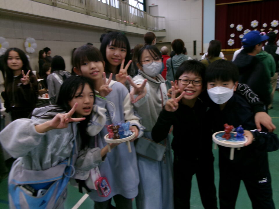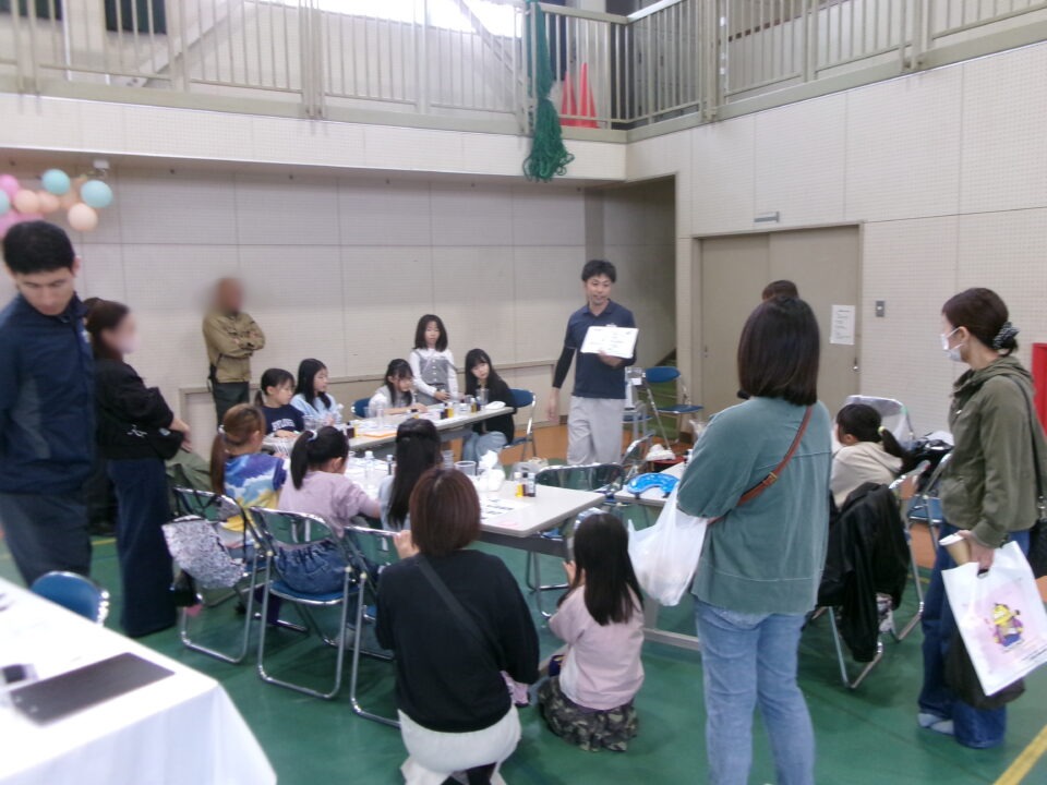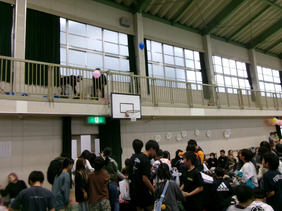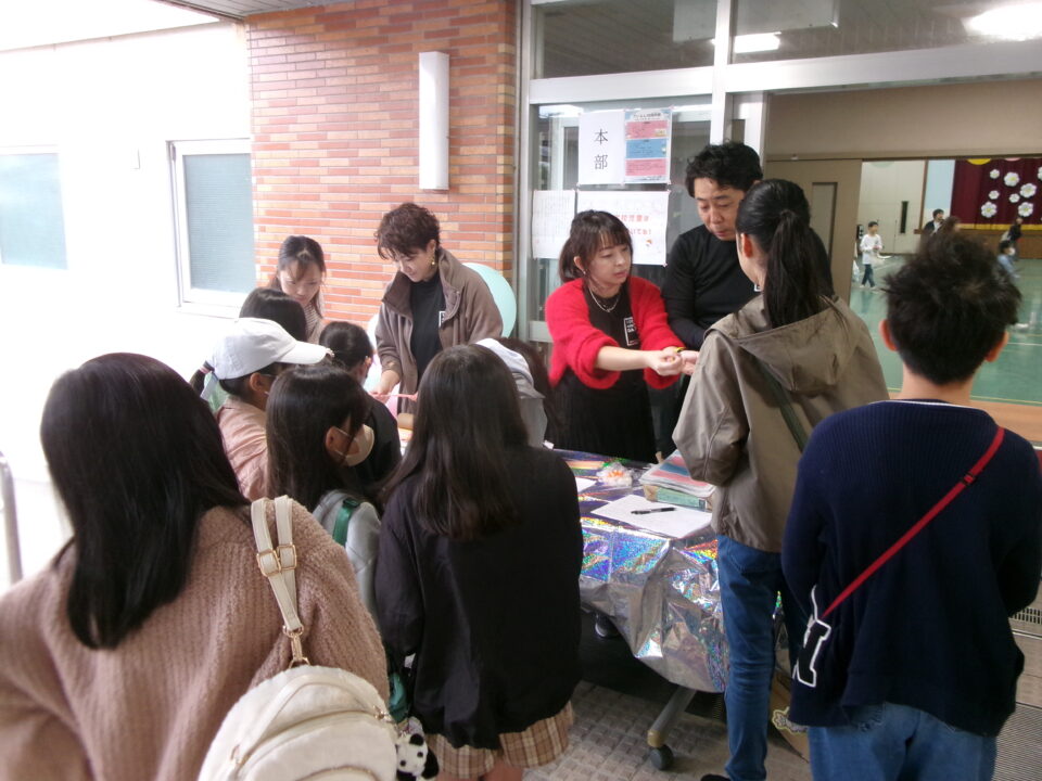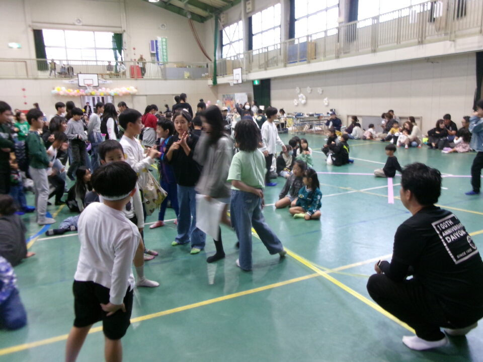 体育館では、測量体験、キーホルダーづくり、ヘアアレンジ教室、オリジナル保冷剤づくり、フォトブースなどがあり、11時から「寛水流空手港道場」の演武・空手体験、12時から「DanceTeamArzu」のダンス発表、14時から「スペシャルイベント」で〇✕クイズやじゃんけん大会、お菓子まき、校歌斉唱があり、とっても盛り上がりました。