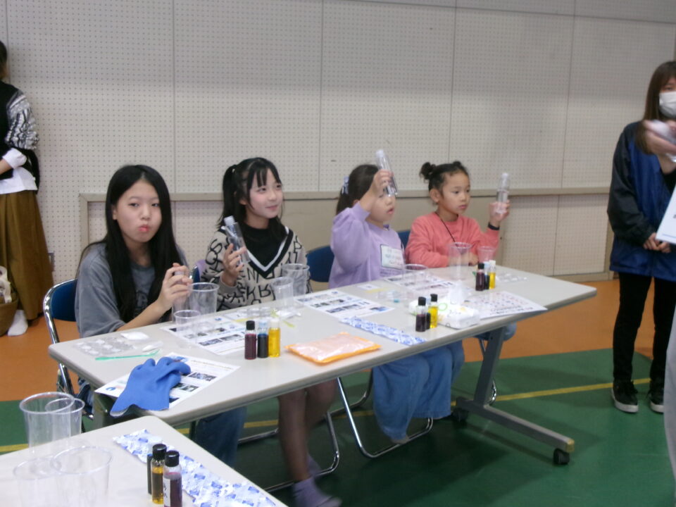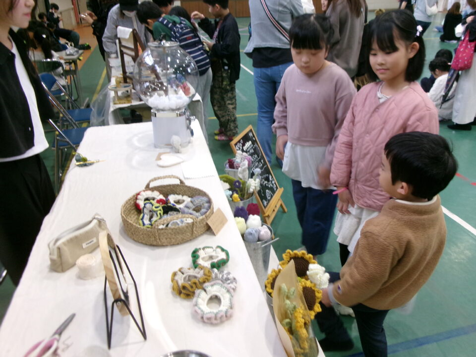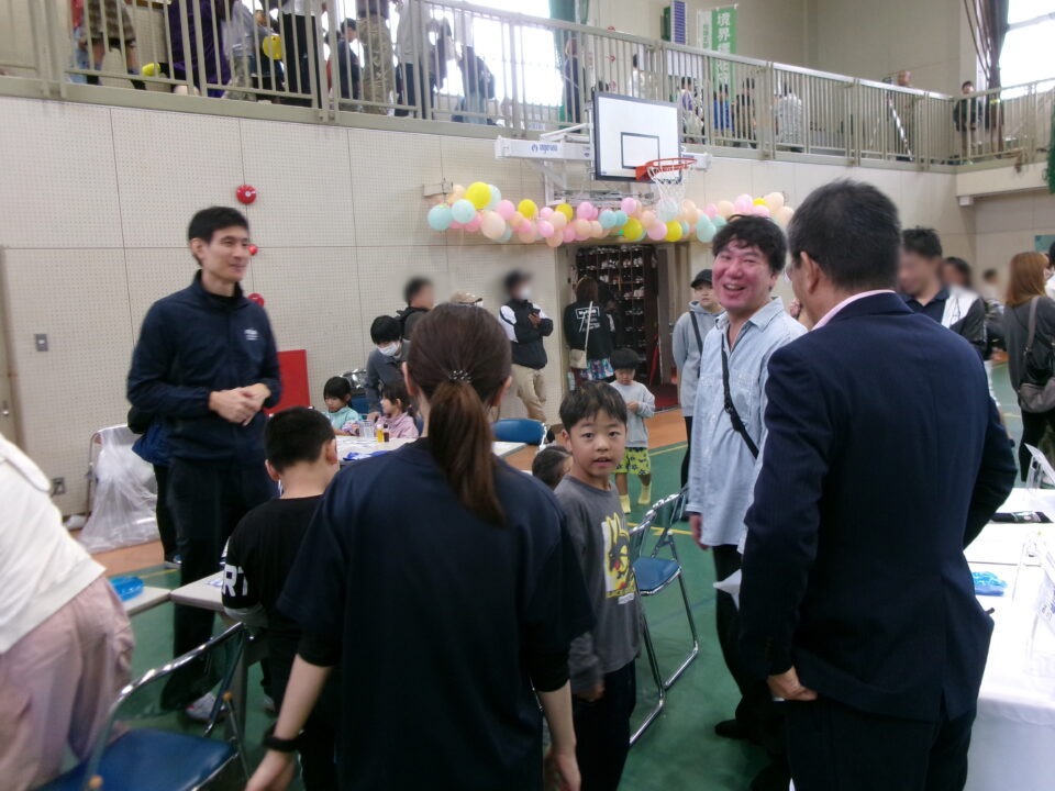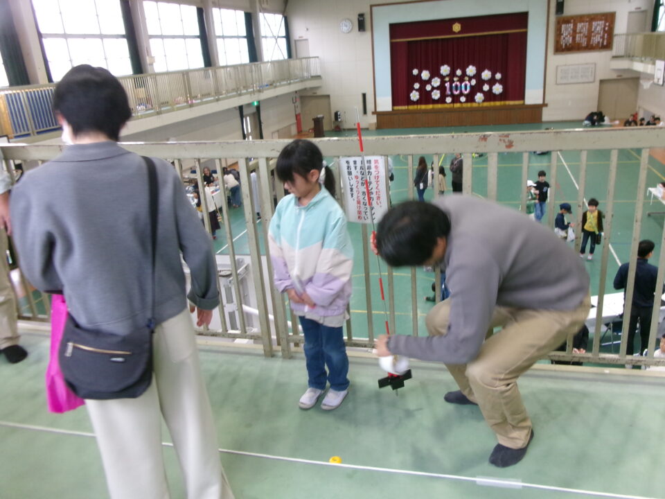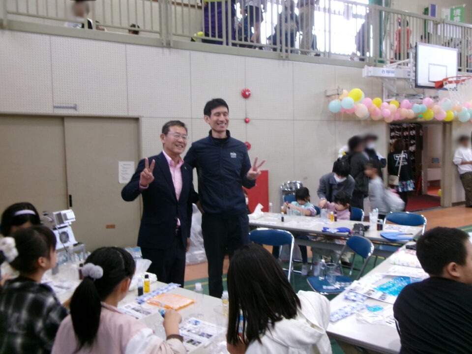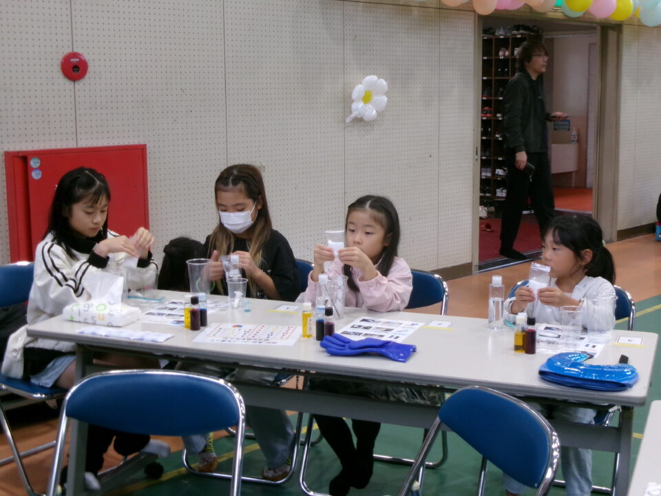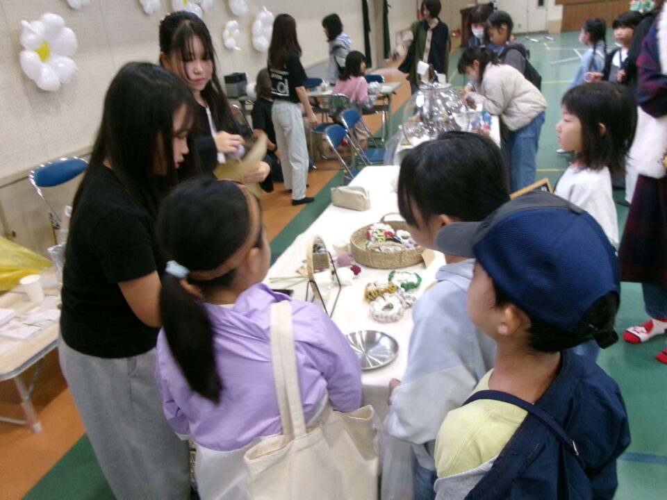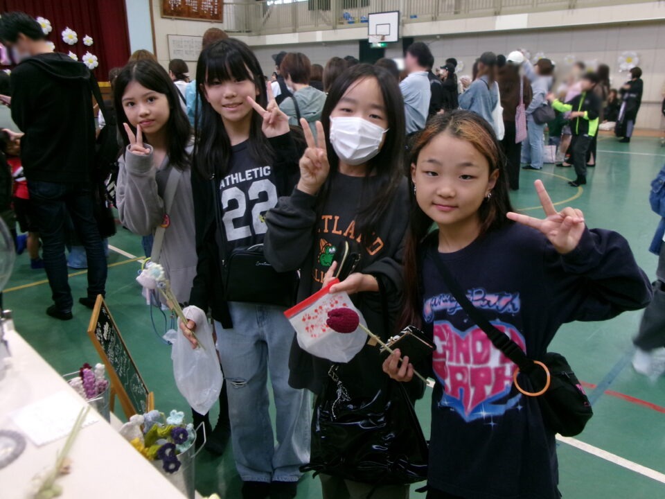 体育館では、測量体験、キーホルダーづくり、ヘアアレンジ教室、オリジナル保冷剤づくり、フォトブースなどがあり、11時から「寛水流空手港道場」の演武・空手体験、12時から「DanceTeamArzu」のダンス発表、14時から「スペシャルイベント」で〇✕クイズやじゃんけん大会、お菓子まき、校歌斉唱があり、とっても盛り上がりました。