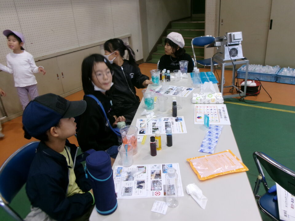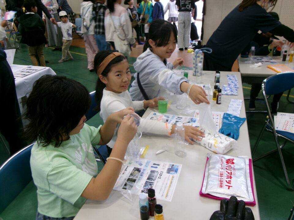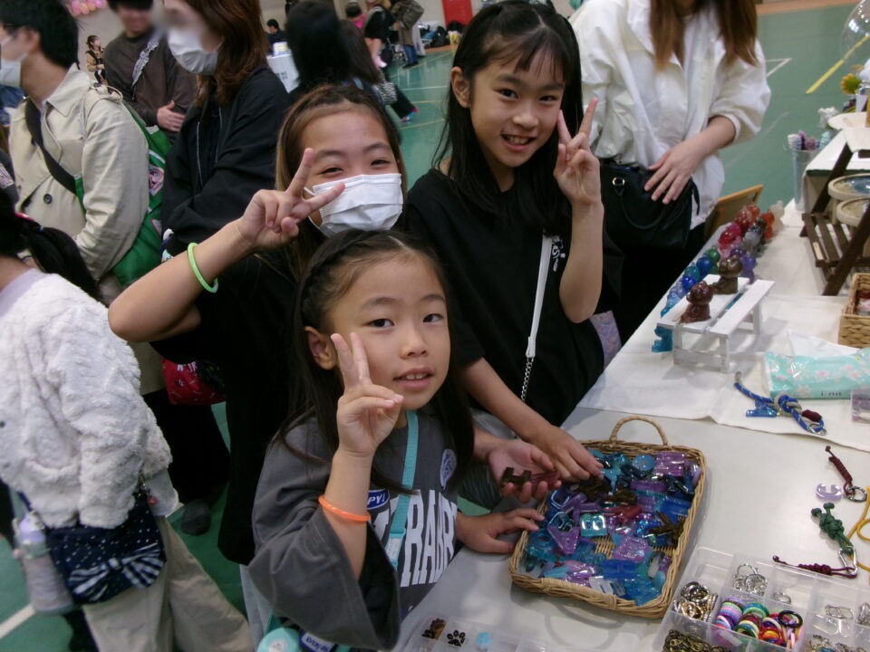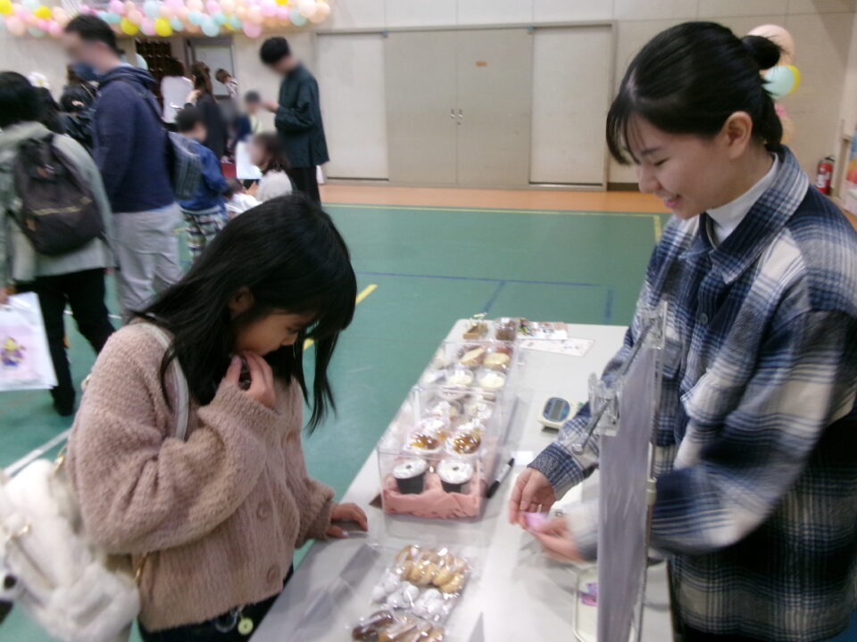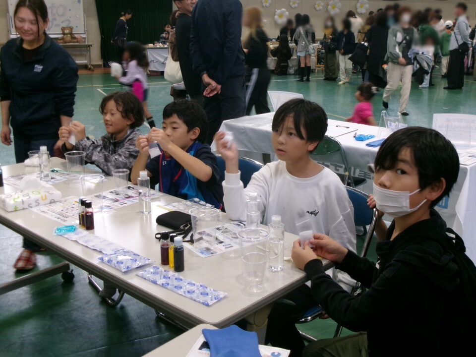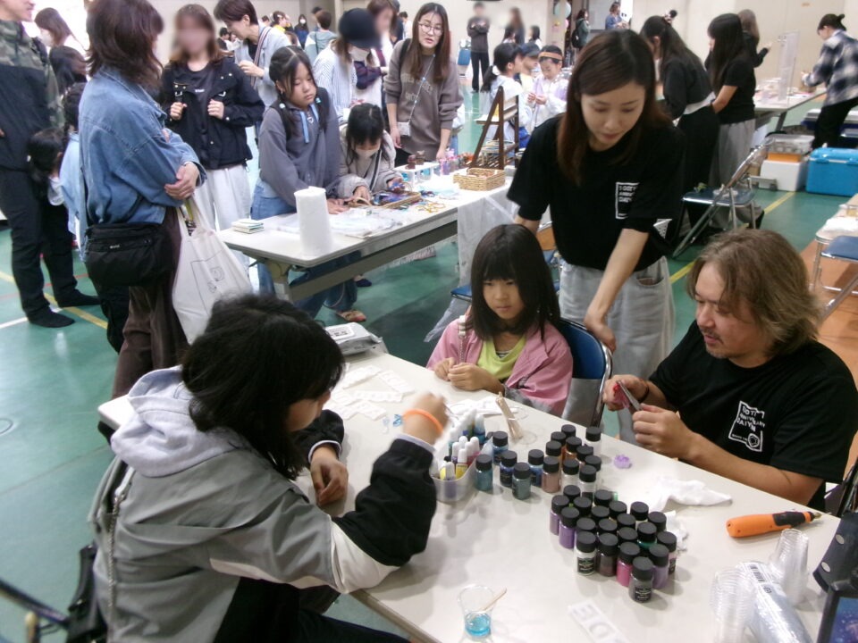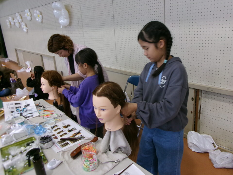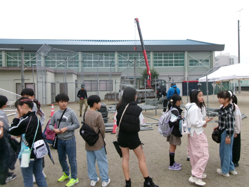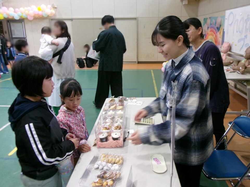 体育館では、測量体験、キーホルダーづくり、ヘアアレンジ教室、オリジナル保冷剤づくり、フォトブースなどがあり、11時から「寛水流空手港道場」の演武・空手体験、12時から「DanceTeamArzu」のダンス発表、14時から「スペシャルイベント」で〇✕クイズやじゃんけん大会、お菓子まき、校歌斉唱があり、とっても盛り上がりました。