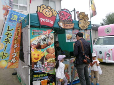 運動場では、キッチンカーが並び、からあげ、ハンバーガー、おだんご、ポテト、あげたこ、ドリンク、パンなどなどたくさんのおいしそうな食べ物や飲み物が登場!どれにしようか迷いましたね。