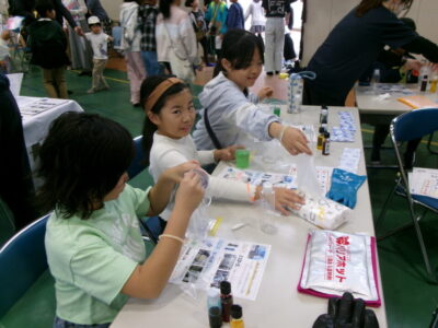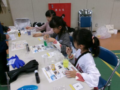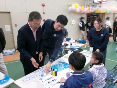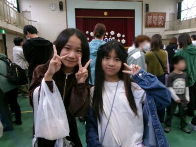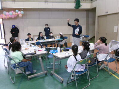 体育館では、測量体験、キーホルダーづくり、ヘアアレンジ教室、オリジナル保冷剤づくり、フォトブースなどがあり、11時から「寛水流空手港道場」の演武・空手体験、12時から「DanceTeamArzu」のダンス発表、14時から「スペシャルイベント」で〇✕クイズやじゃんけん大会、お菓子まき、校歌斉唱があり、とっても盛り上がりました。