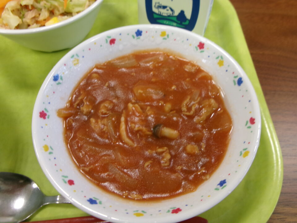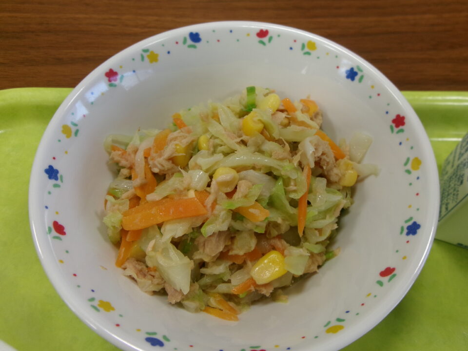 今日の学校の給食は、ご飯、牛乳、米粉のハッシュドポーク、ツナとコーンのサラダでした。