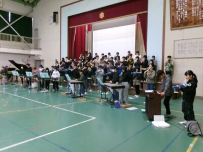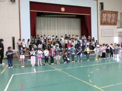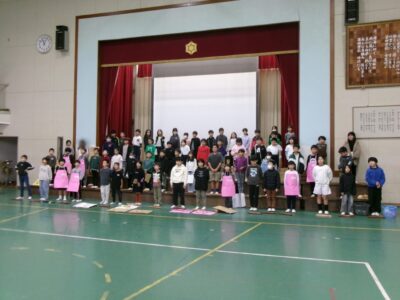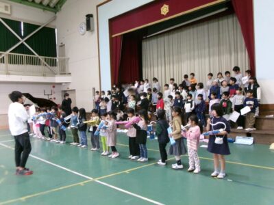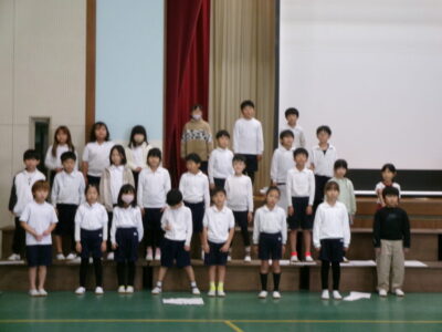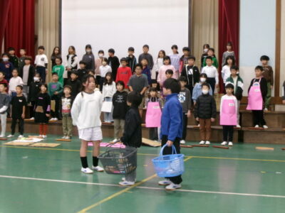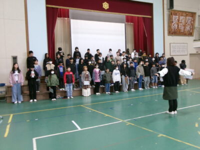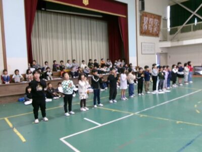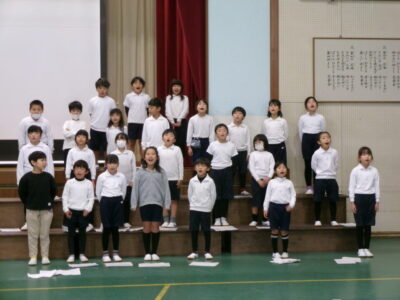 体育館の発表会練習では、立ち位置や入場、退場の仕方、声の出し方などを練習しながら、見ていただく方に自分たちの学びを伝えるために、頑張って練習しています。