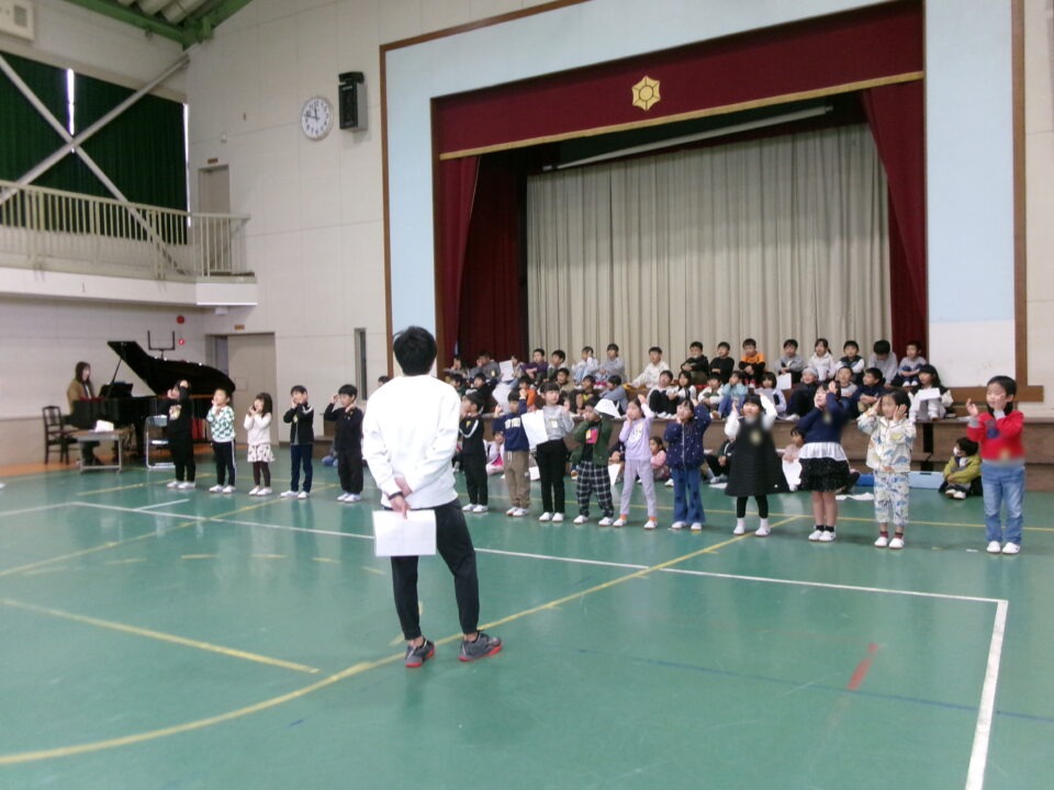 体育館の発表会練習では、立ち位置や入場、退場の仕方、声の出し方などを練習しながら、見ていただく方に自分たちの学びを伝えるために、頑張って練習しています。