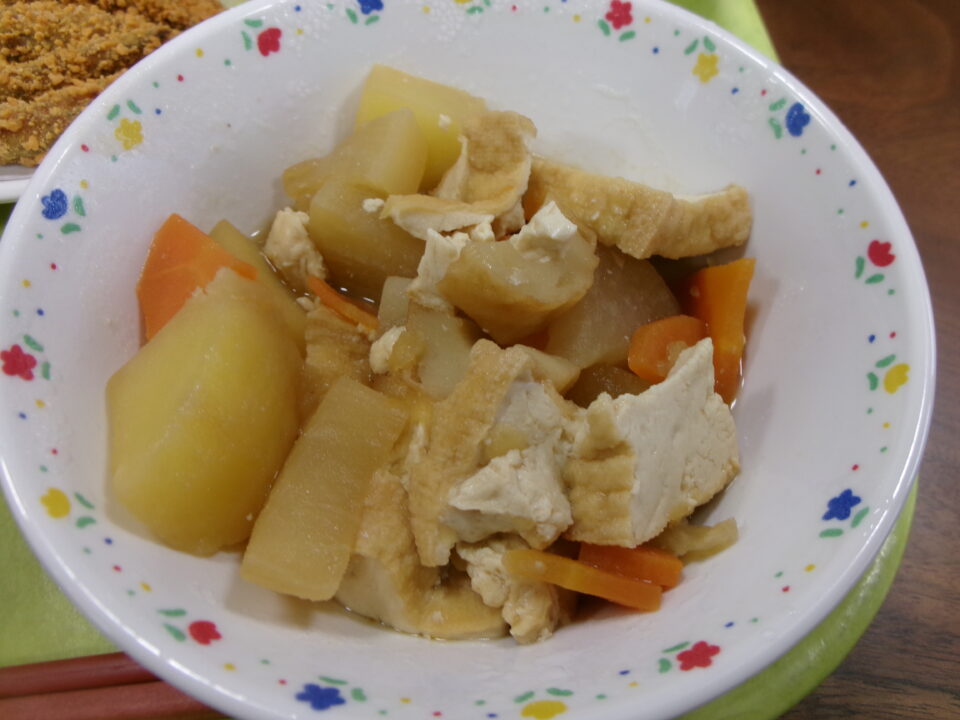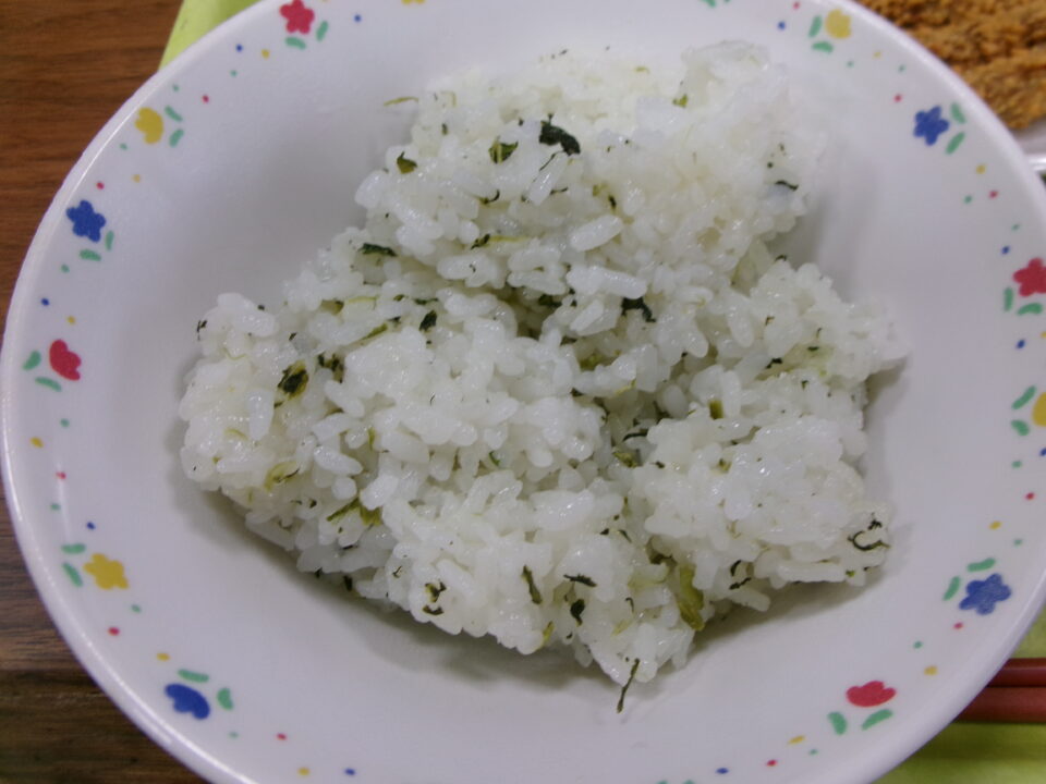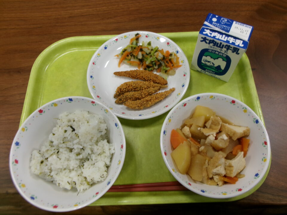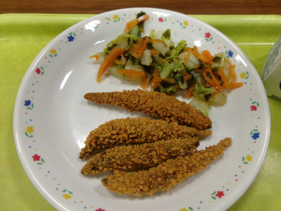 今日きょう給食きゅうしょくは、菜飯なめし牛乳ぎゅうにゅう、きびなごのかりかりフライ、白菜はくさい磯和いそあえ、厚揚あつあげのほっこりでした。