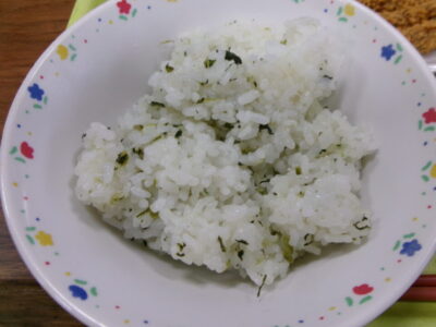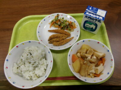 今日の給食は、菜飯、牛乳、きびなごのかりかりフライ、白菜の磯和え、厚揚げのほっこり煮でした。