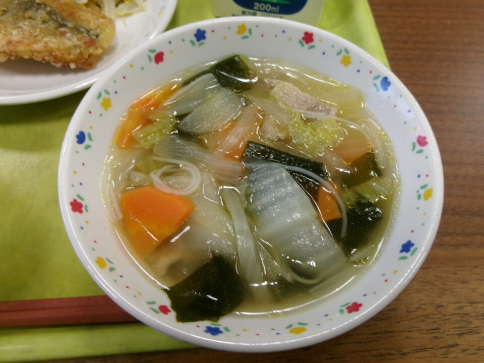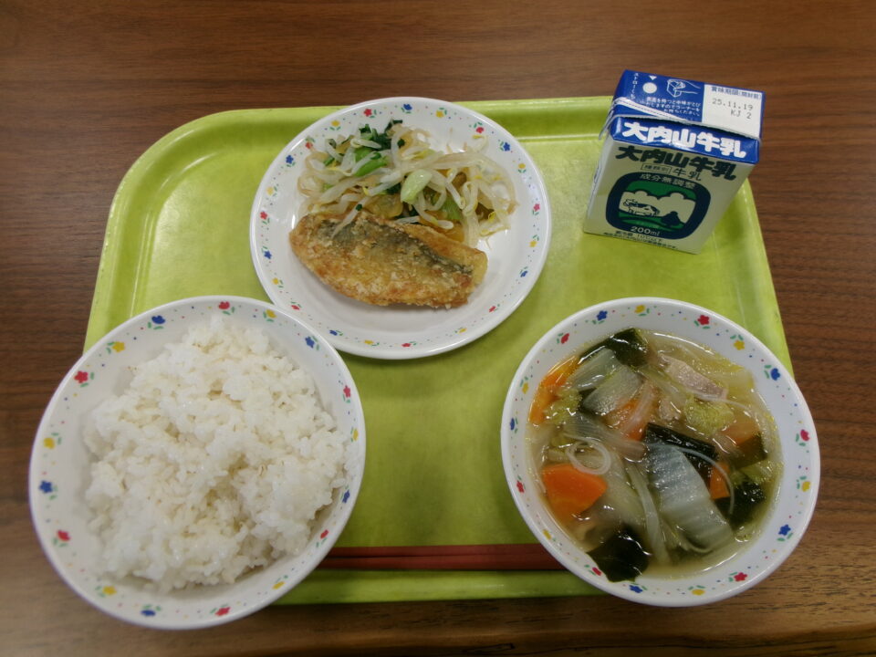 今日の給食は、ご飯(麦入り)、牛乳、あじのから揚げ、チンゲンサイともやしの福神和え、ビーフン入りわかめスープでした。
