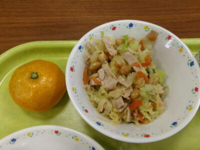 今日の給食は、黒糖パン、牛乳、白菜の米粉ポタージュ、大豆入りサラダ、みかんでした。