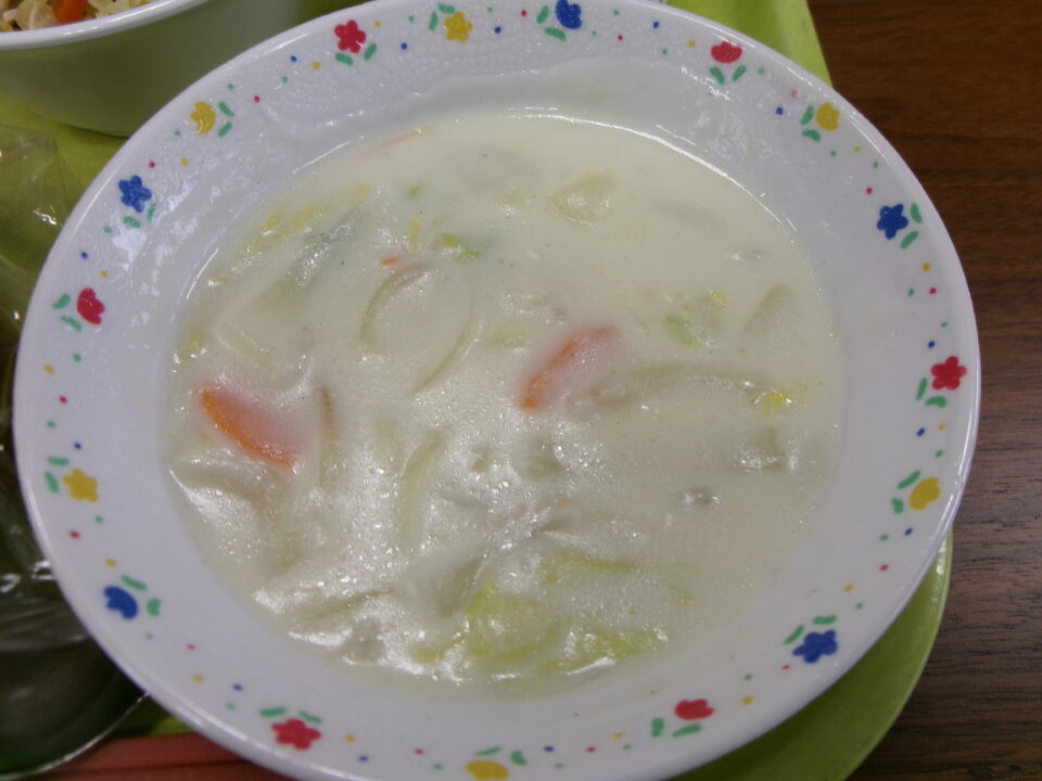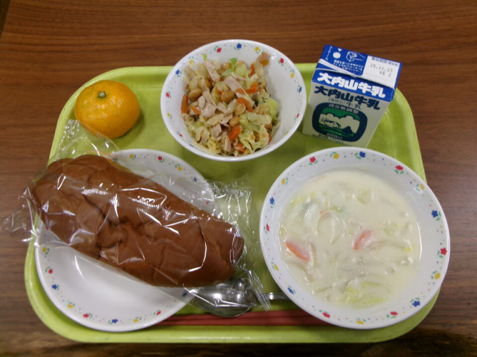 今日の給食は、黒糖パン、牛乳、白菜の米粉ポタージュ、大豆入りサラダ、みかんでした。