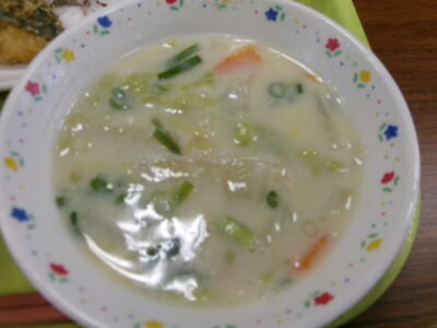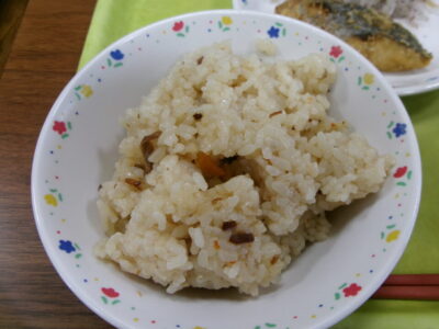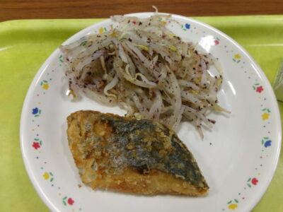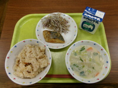今日きょう給食きゅうしょくは、まいたけみごはん牛乳ぎゅうにゅう、さわらの竜田揚たつたあげ、もやしのしそえ、豆乳汁とうにゅうじるでした。