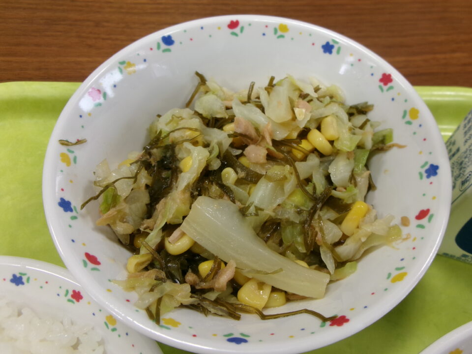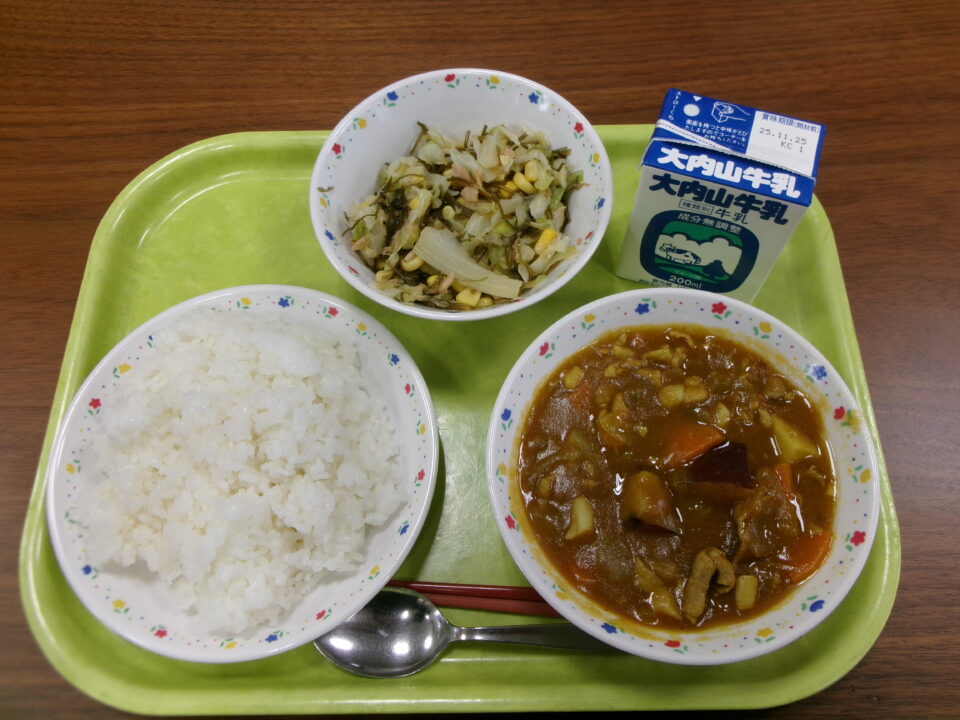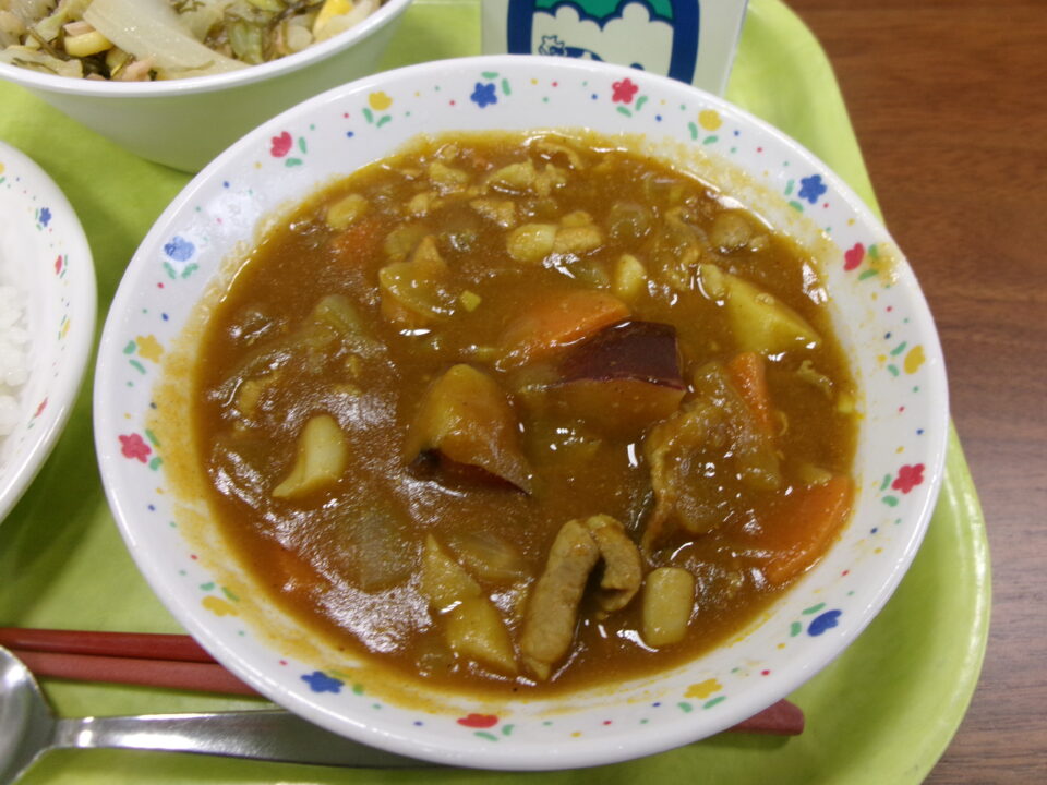今日の給食は、ご飯、さつまいもとしめじのカレー、牛乳、こんぶのミネラルサラダでした。