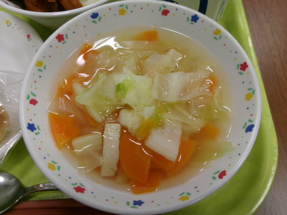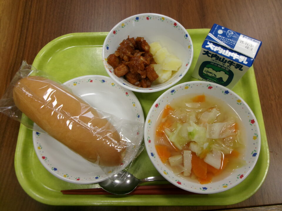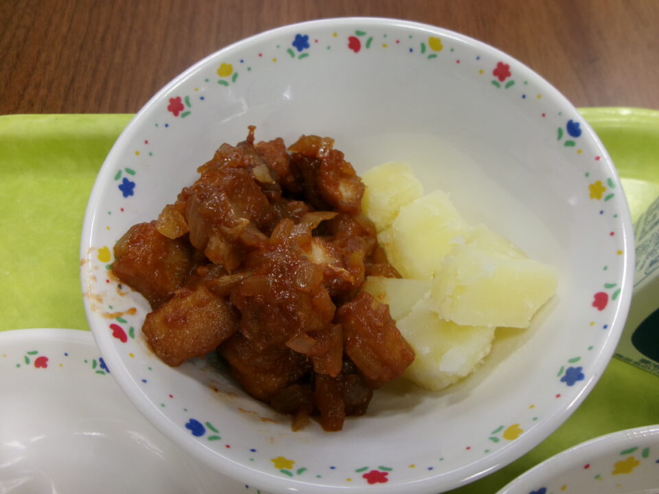 今日の給食は、米粉入りパン、牛乳、まぐろのオニオンソース、粉ふきいも、コンソメスープでした。