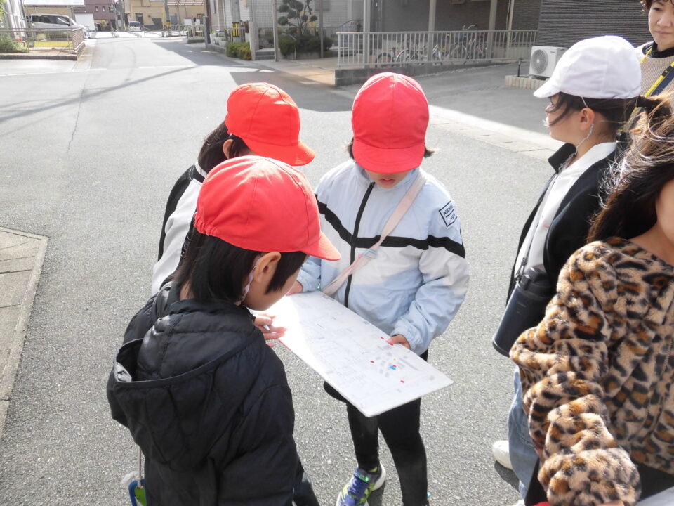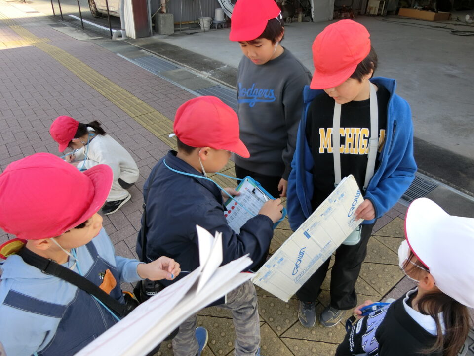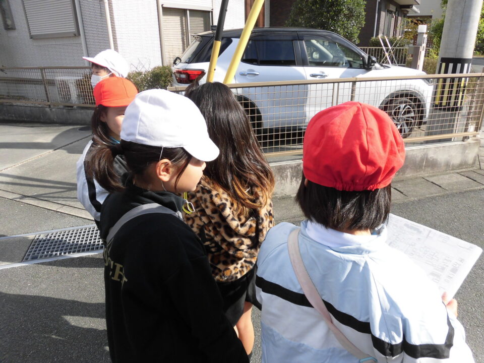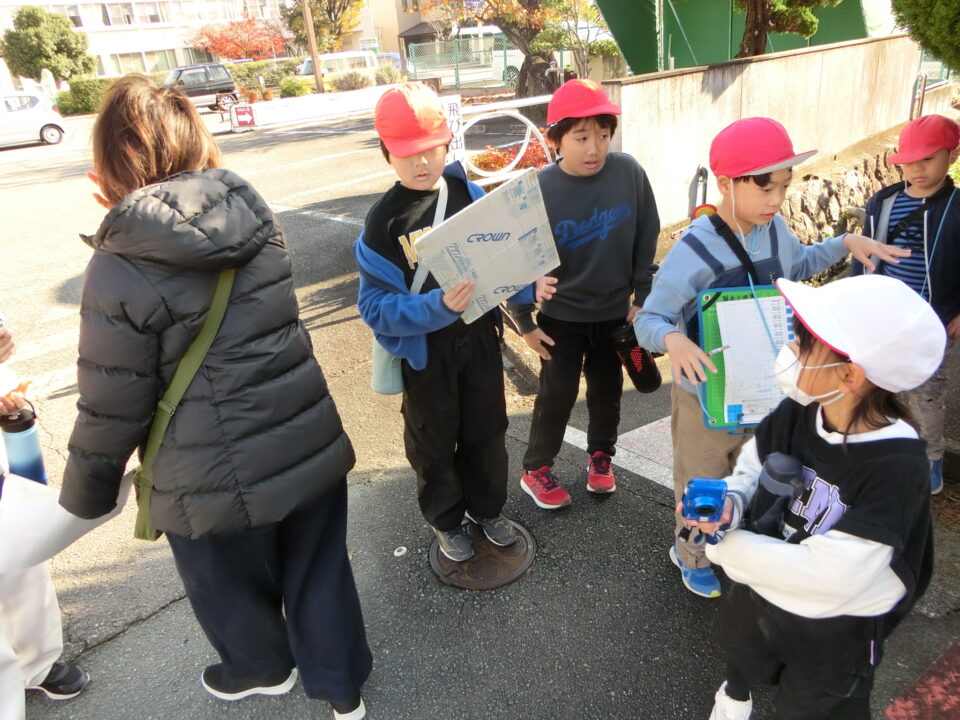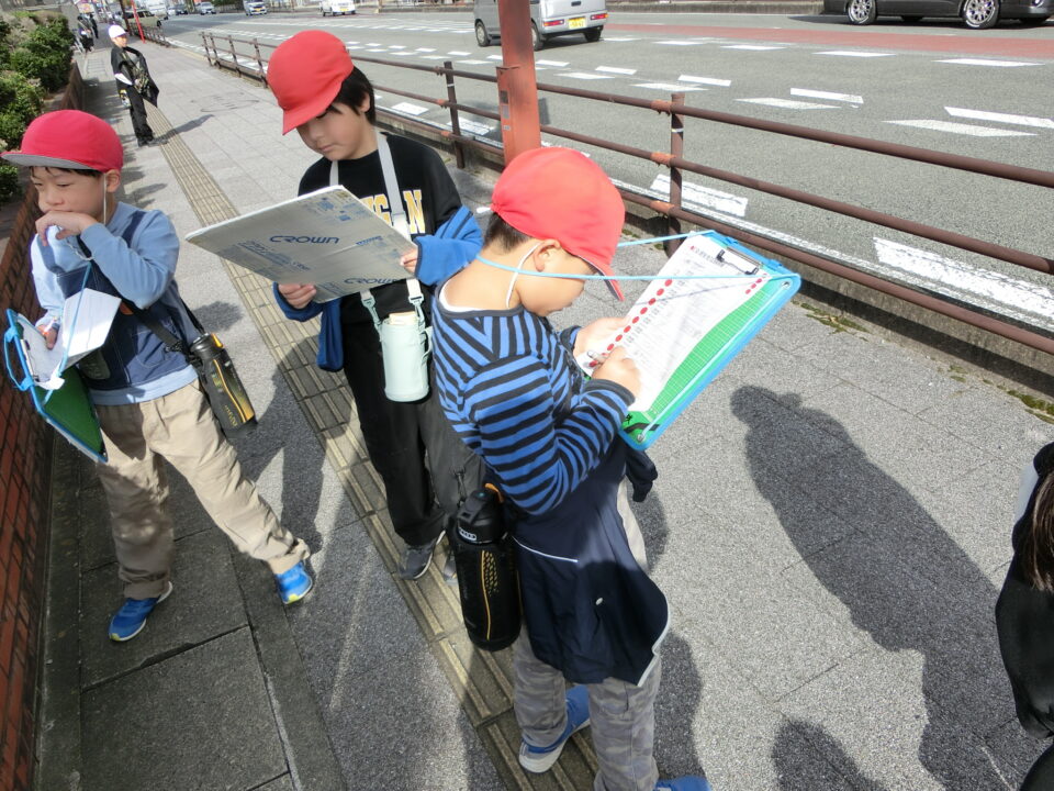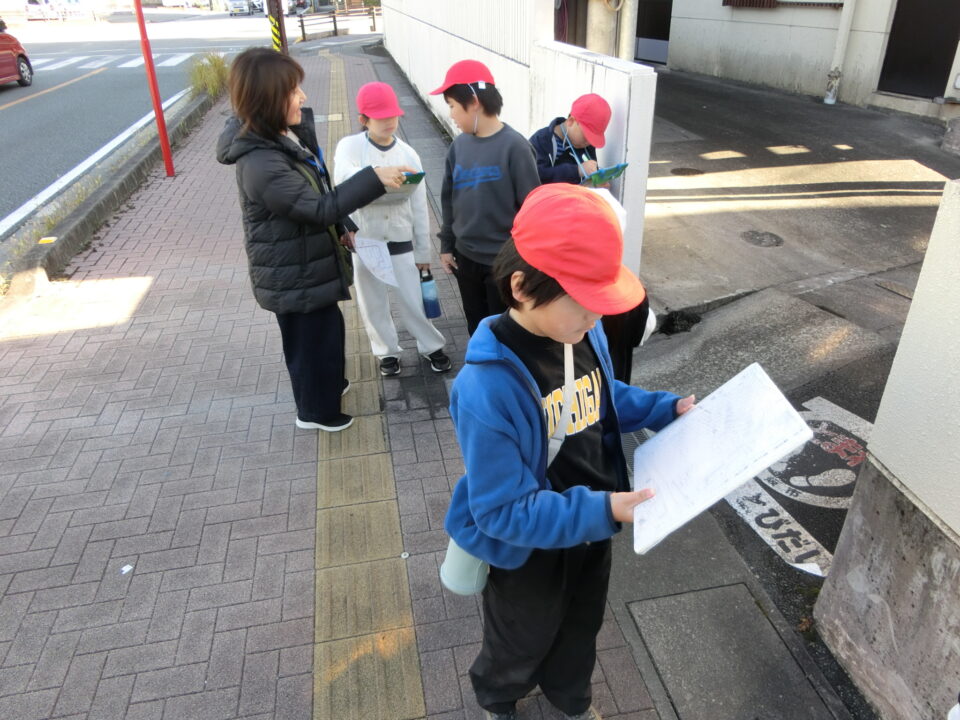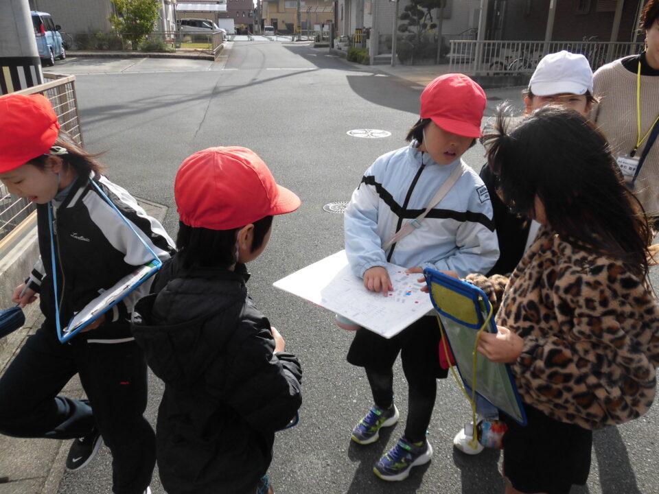 今日は、3年生が「交通安全・防犯・防災」の視点で自分の校区を改めて見直す機会としてタウンウォッチングをしました。松阪市地域安全対策課の方に来ていただき、どのようにまとめるかを教えてもらうことで、先の見通しを持ち、写真を撮ったり、地図に記録したりする方法を学びました。