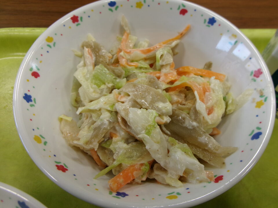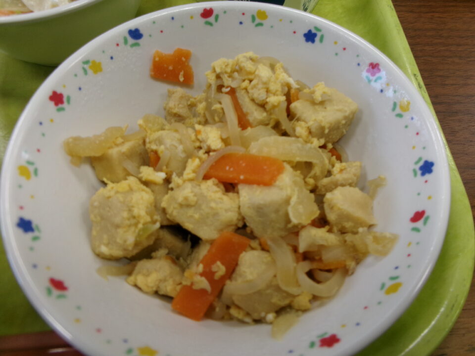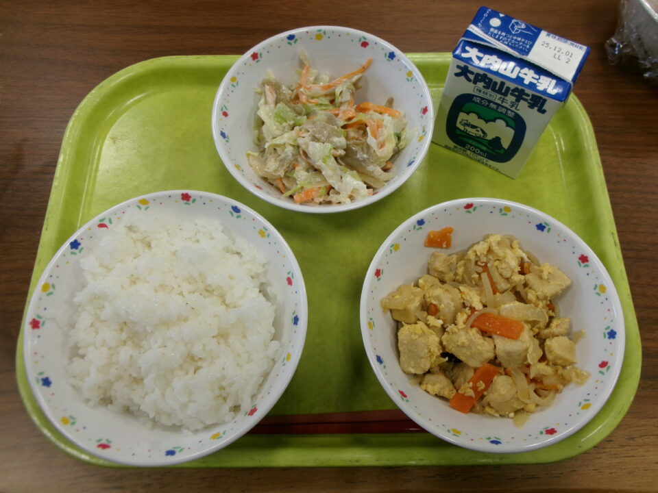 今日の給食は、ご飯、牛乳、高野豆腐の卵とじ、ごぼうサラダでした。