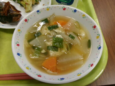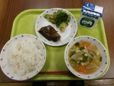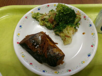 ご飯(麦入り)、牛乳、さばのみそ煮、ブロッコリーのおかか和え、けんちん汁でした。