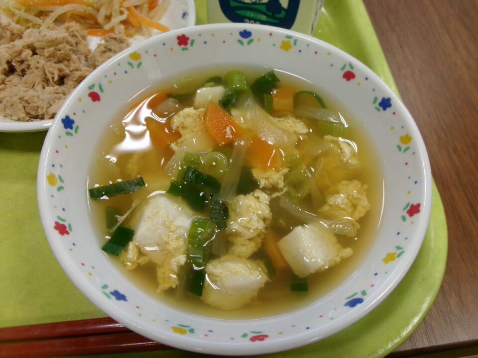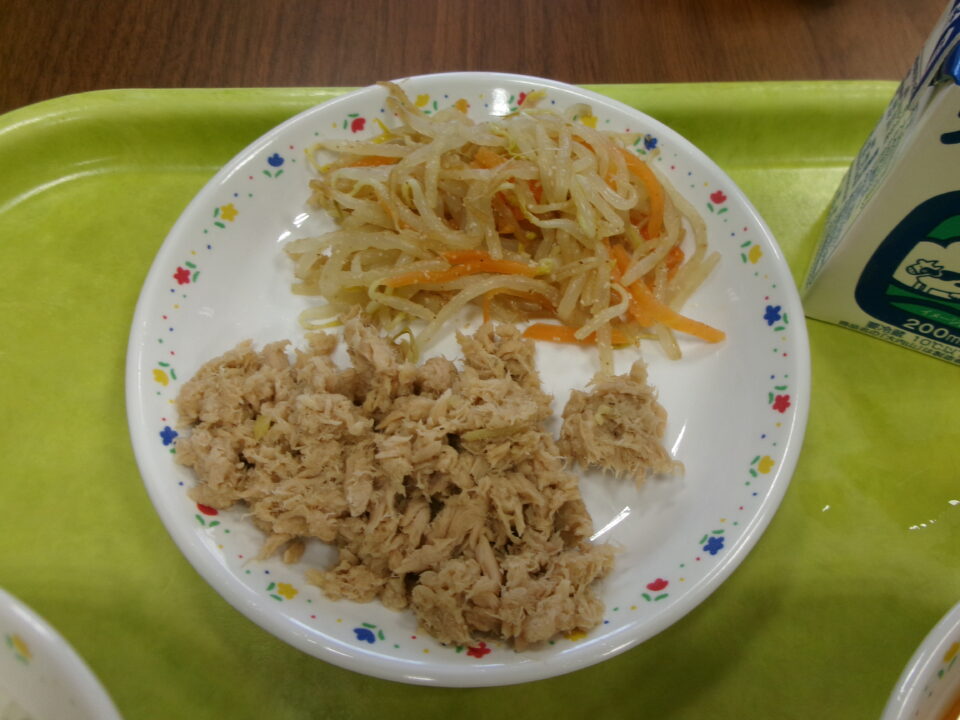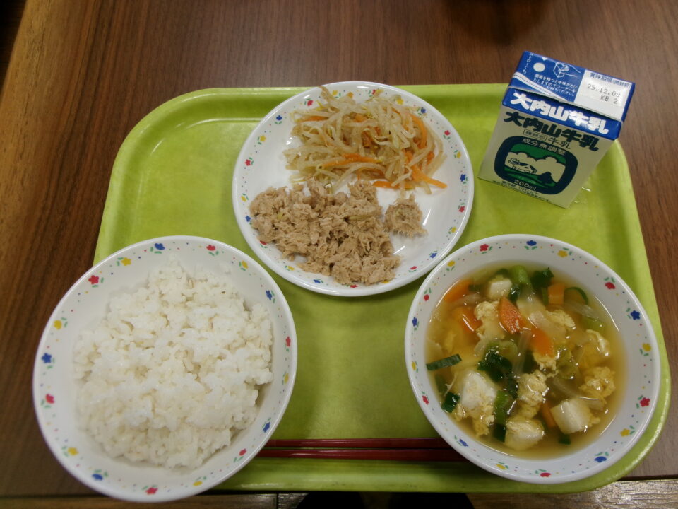 今日の給食は、ご飯(麦入り)、牛乳、ツナそぼろ、にんじんともやしのごま和え、かきたま汁でした。