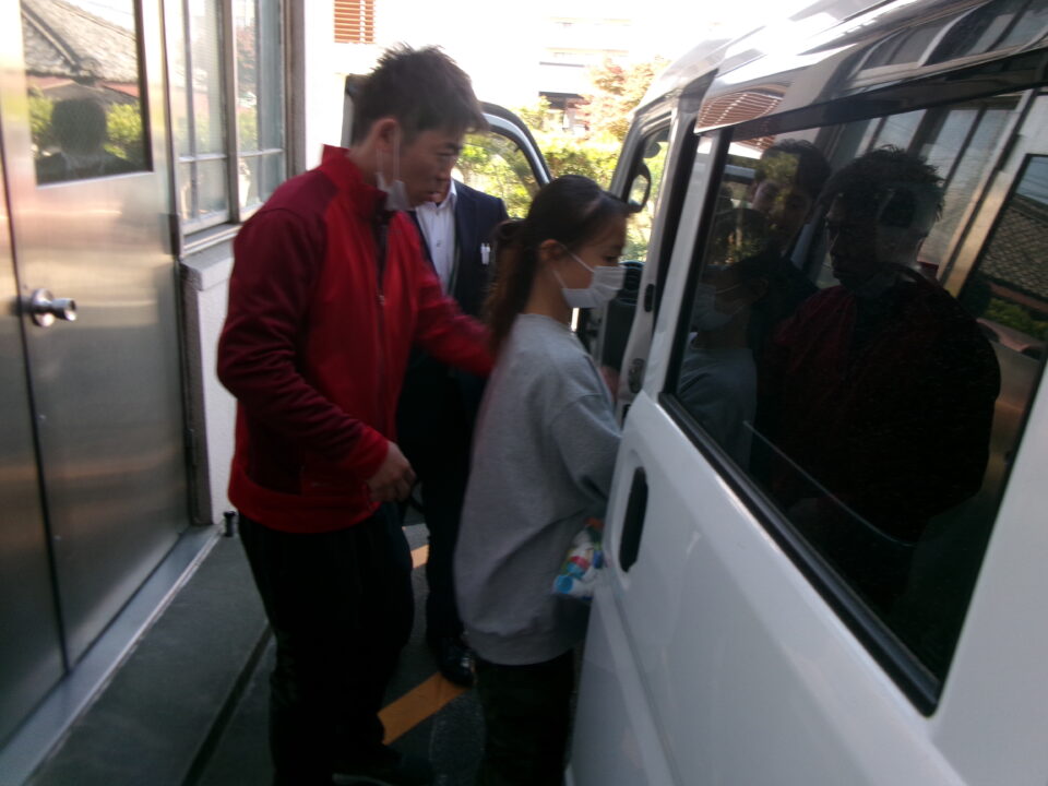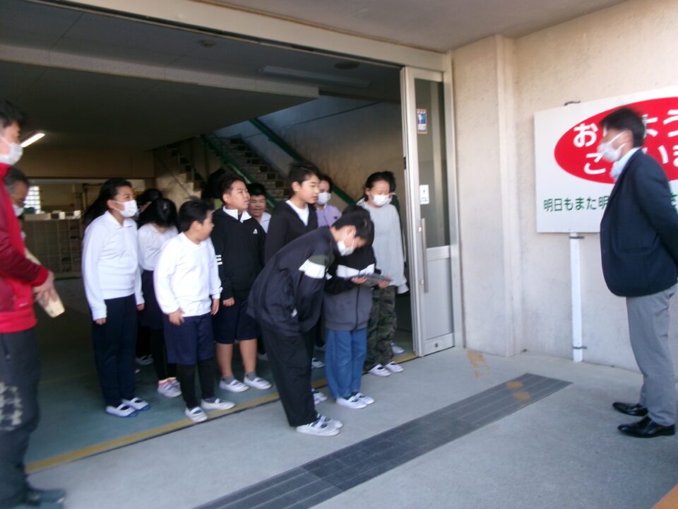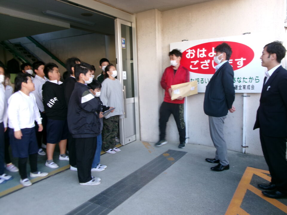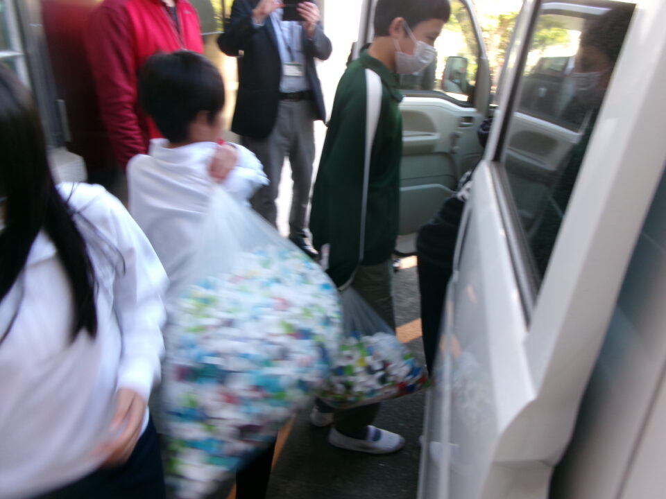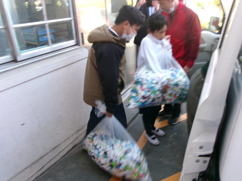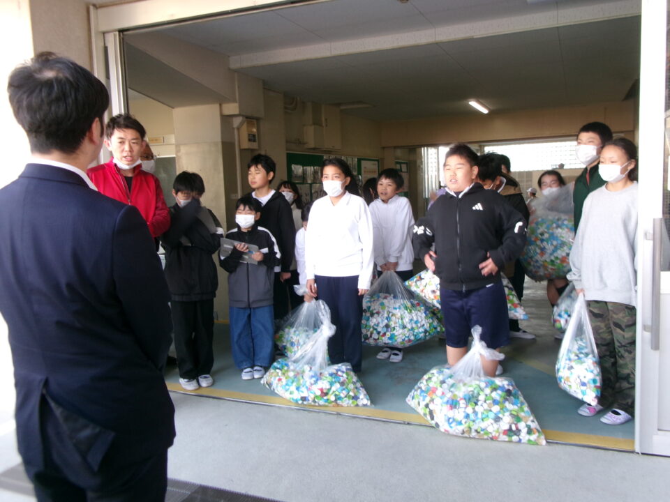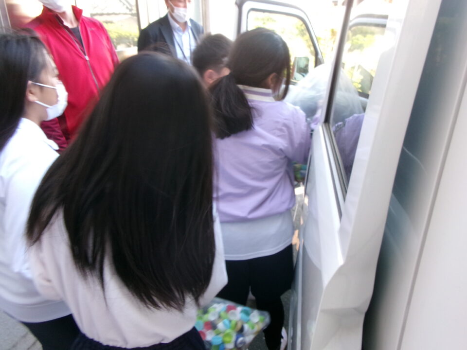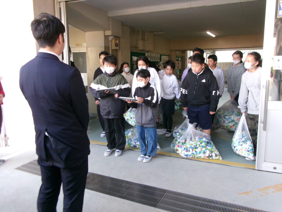 はじめに、環境・ボランティア委員会の委員長・副委員長さんが挨拶をした後、集まったペットボトルキャップを車に運び入れました。
