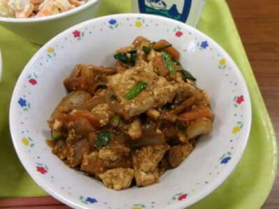 ご飯、牛乳、厚揚げと豚肉のみそ炒め、きわみんサラダでした。