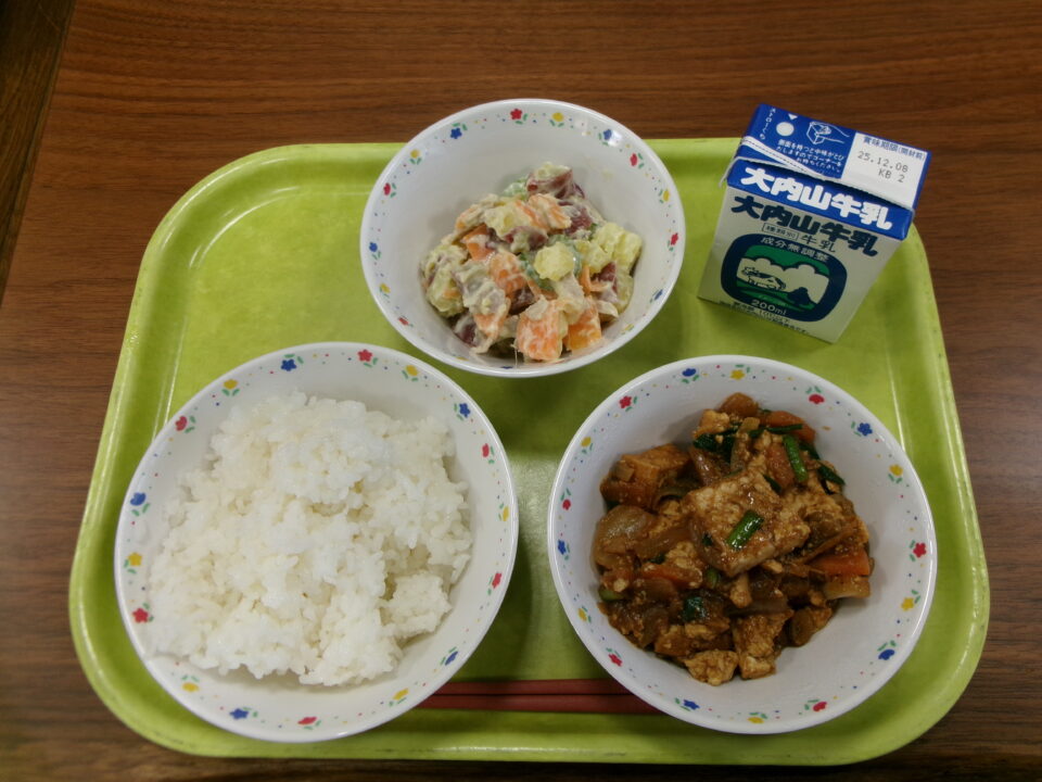 ご飯、牛乳、厚揚げと豚肉のみそ炒め、きわみんサラダでした。