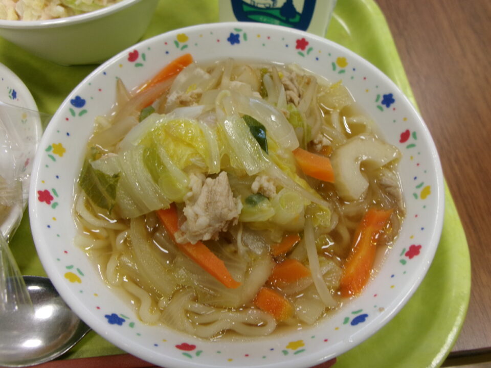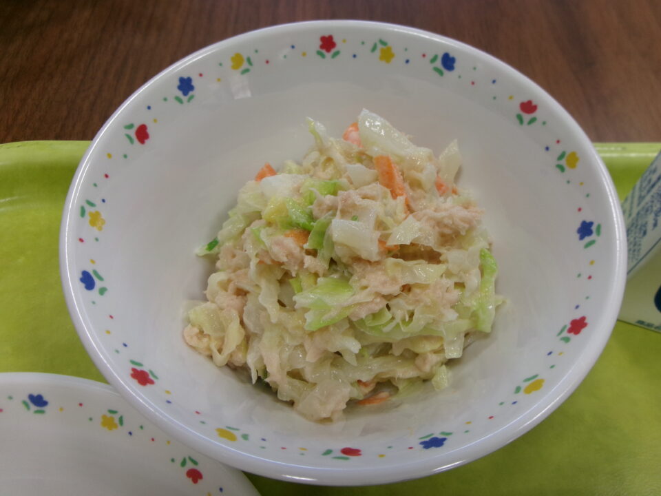 今日の給食は、小型コッペパン、(横切り)、ツナとキャベツのサラダ、牛乳、野菜たっぷりラーメンでした。