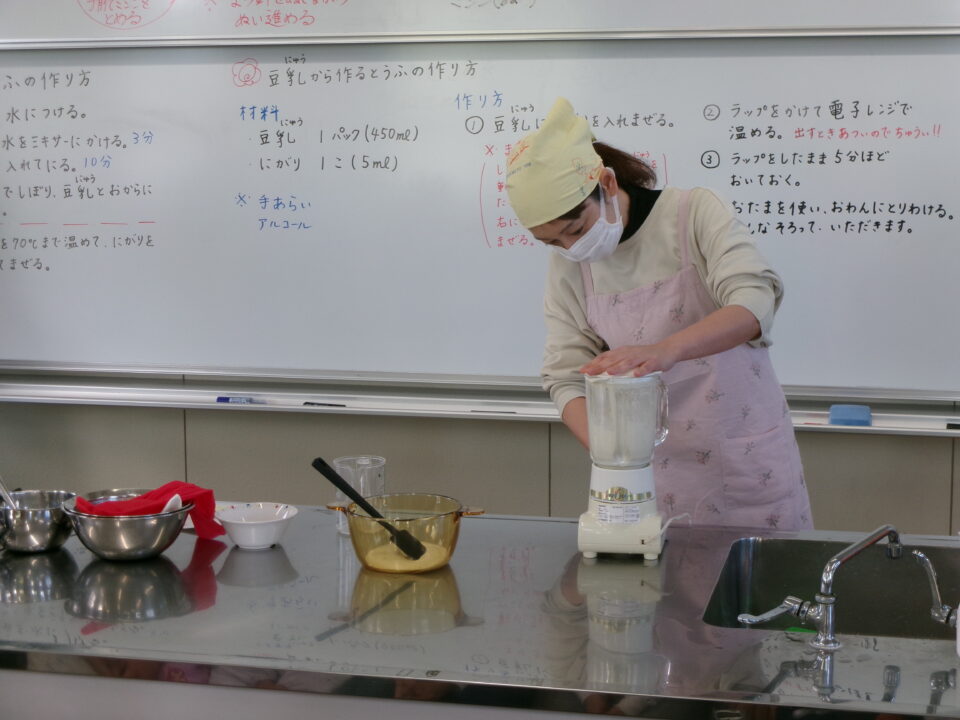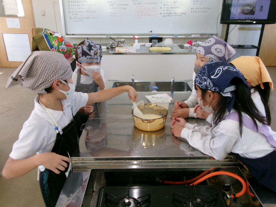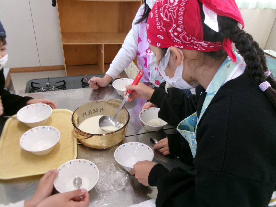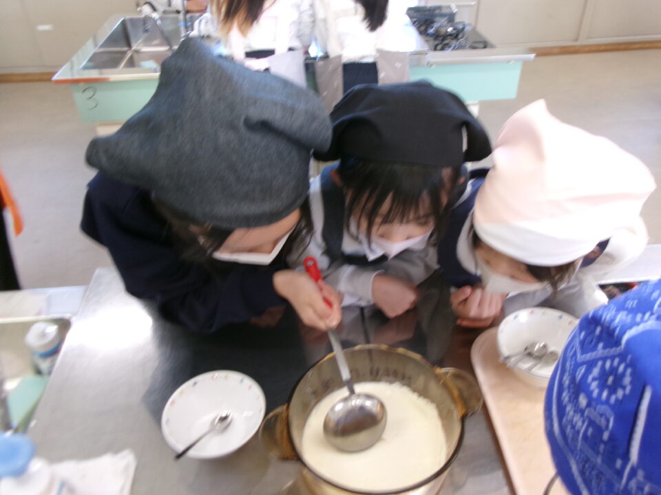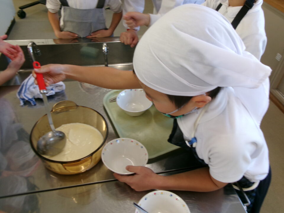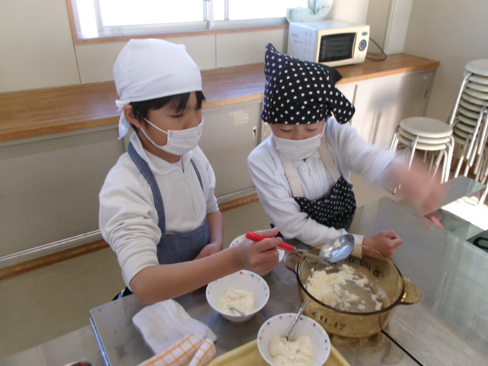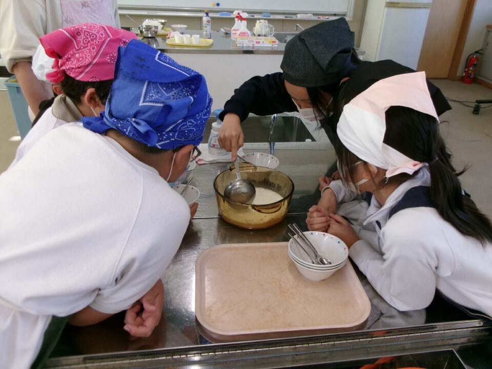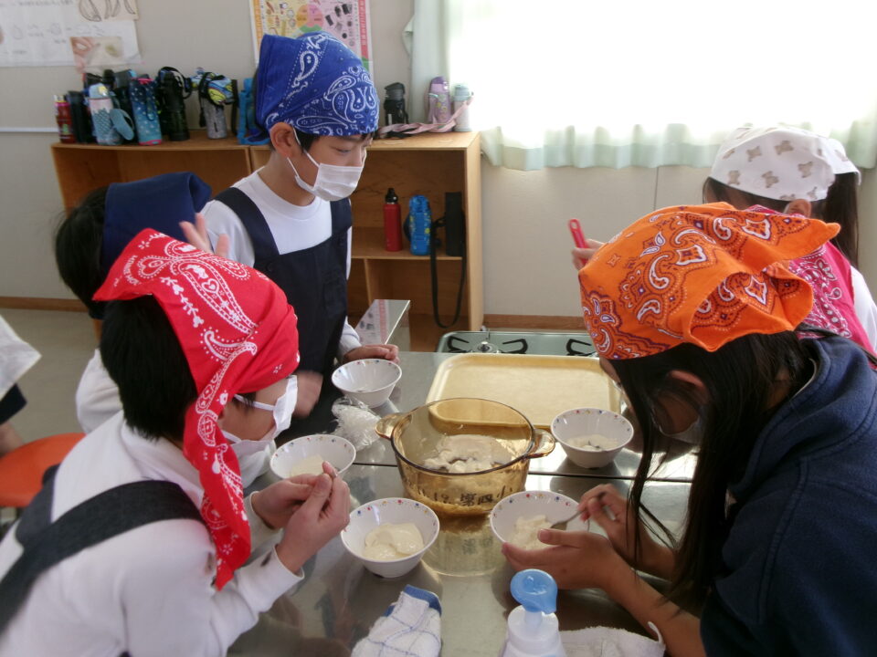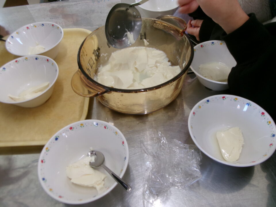 年生ねんせいどもたちは、豆乳とうにゅうからつく実習じっしゅうおこないました。豆乳とうにゅうににがりをれて電子でんしレンジであたためてつくります。これならおうちでもできそうですね。