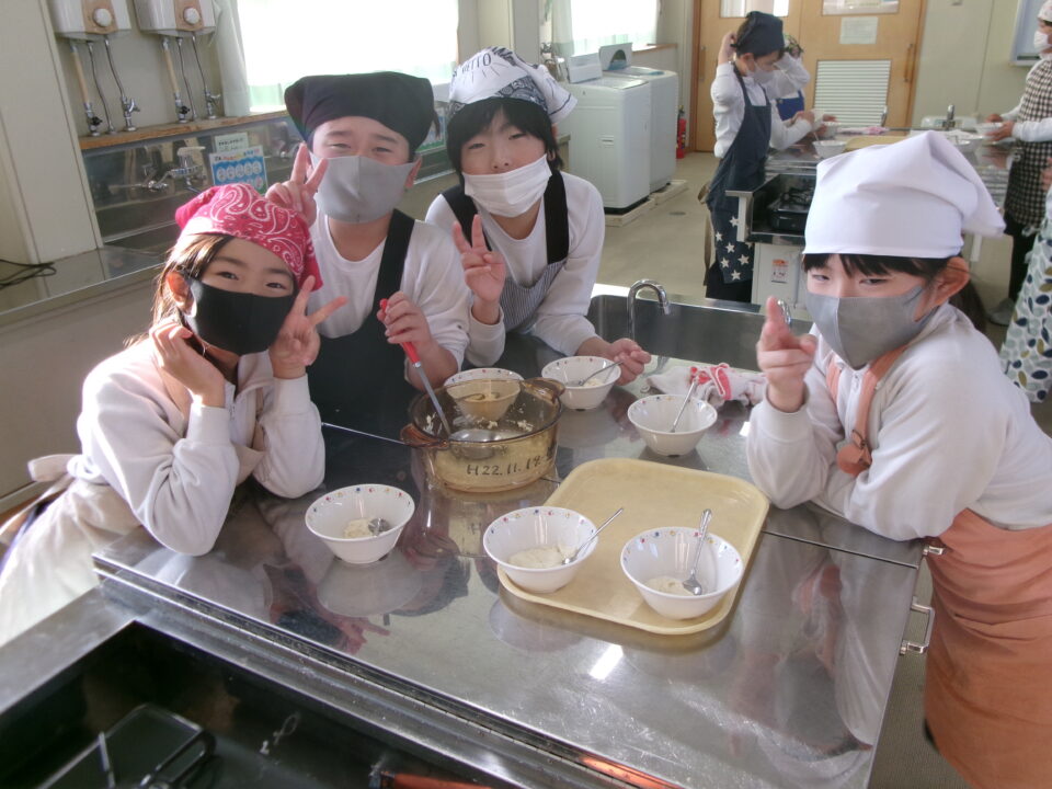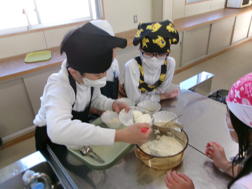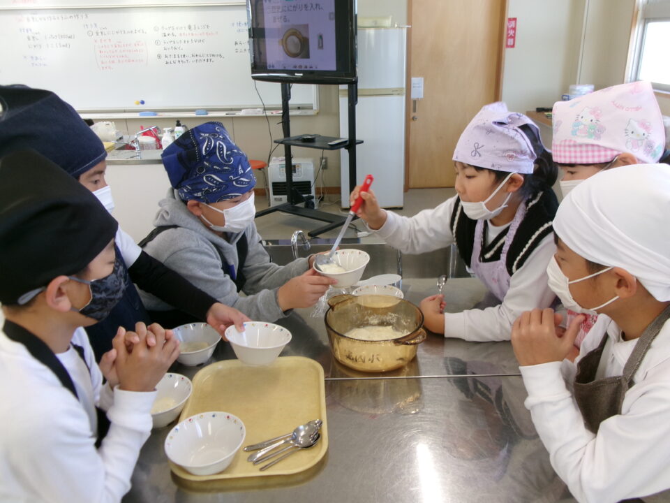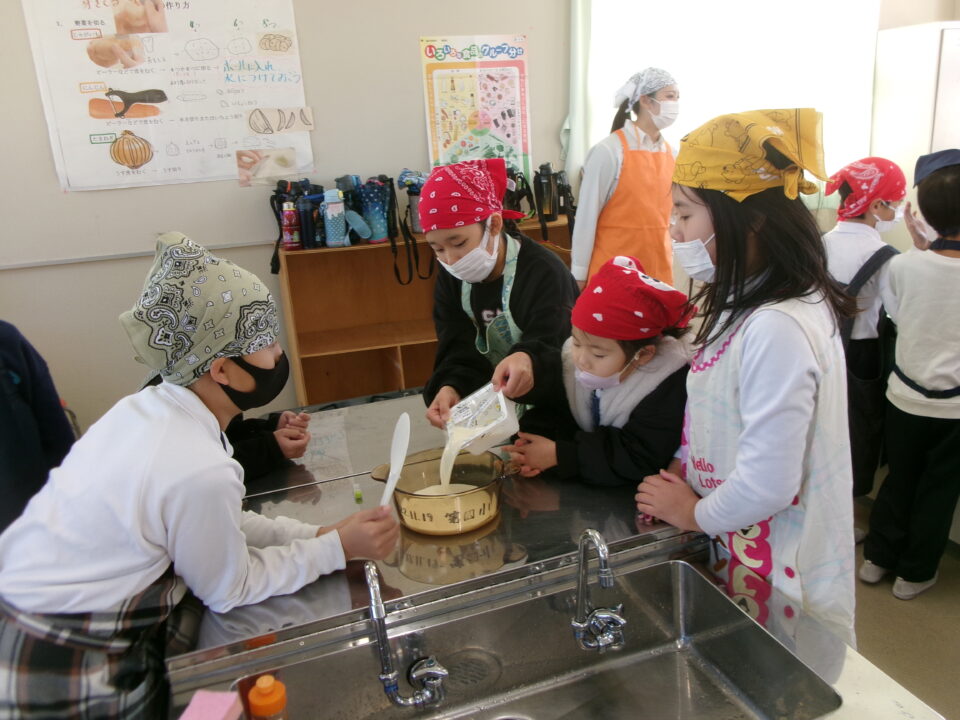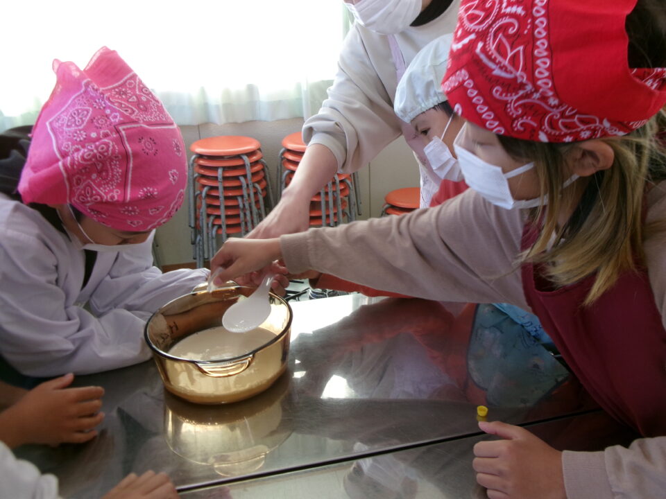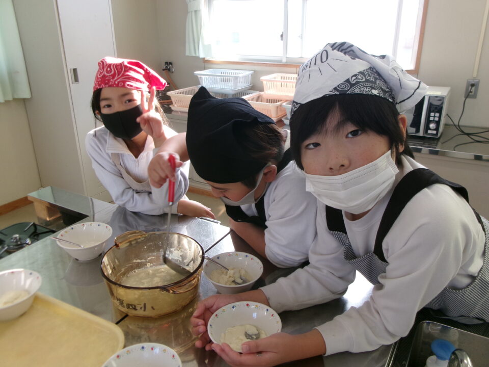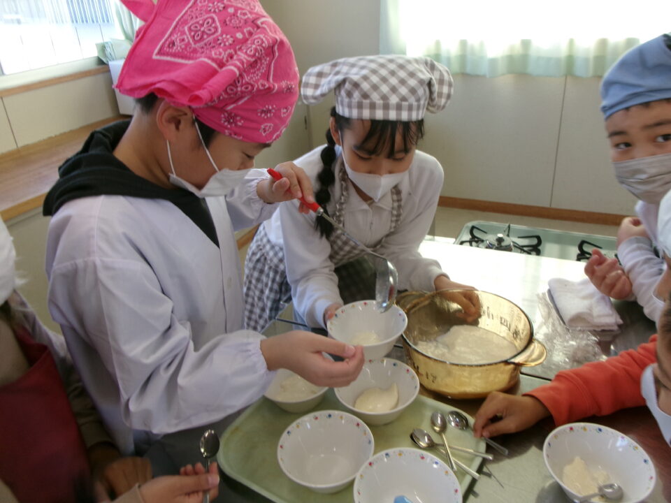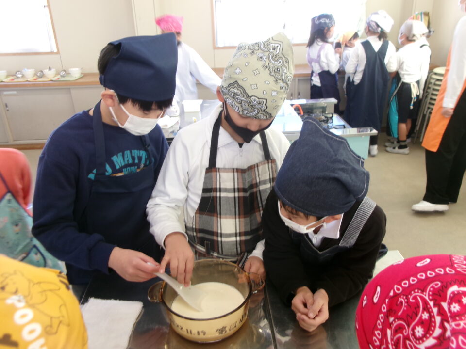 年生ねんせいどもたちは、豆乳とうにゅうからつく実習じっしゅうおこないました。豆乳とうにゅうににがりをれて電子でんしレンジであたためてつくります。これならおうちでもできそうですね。