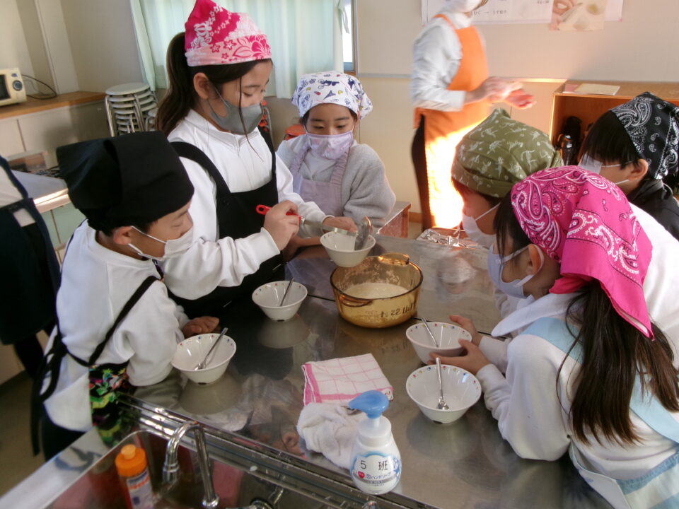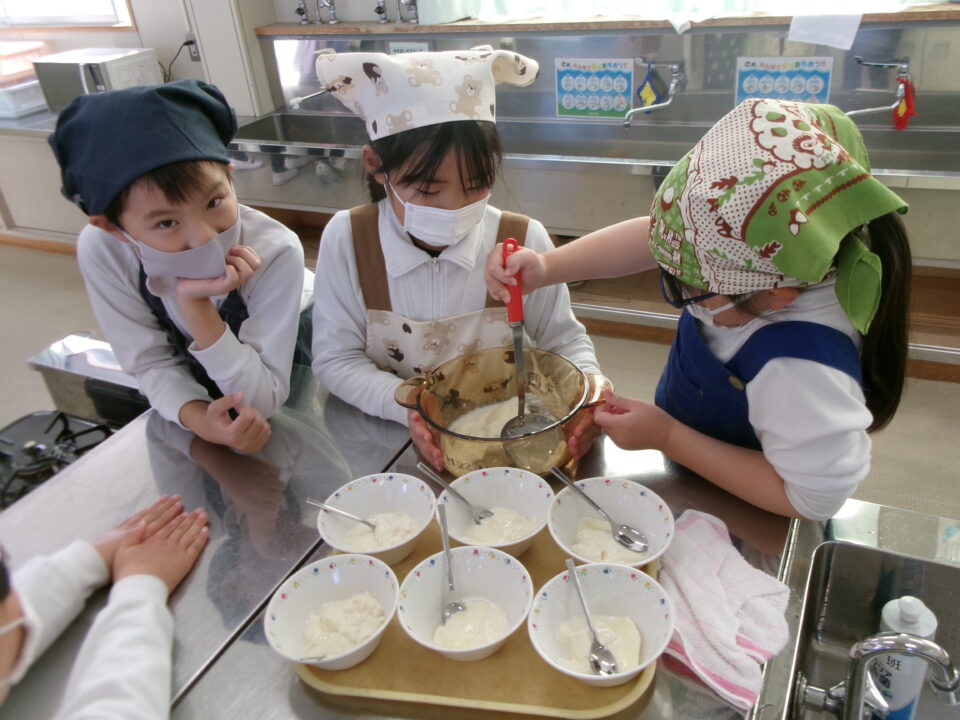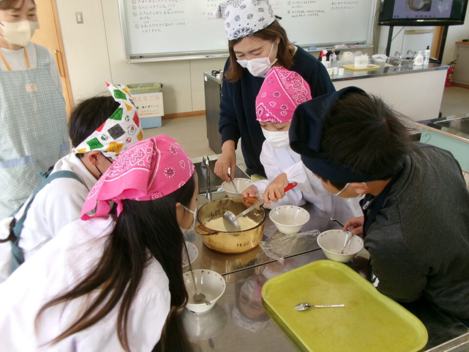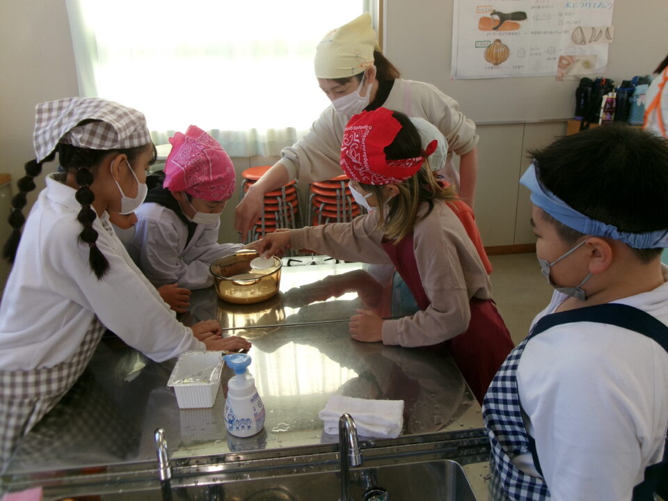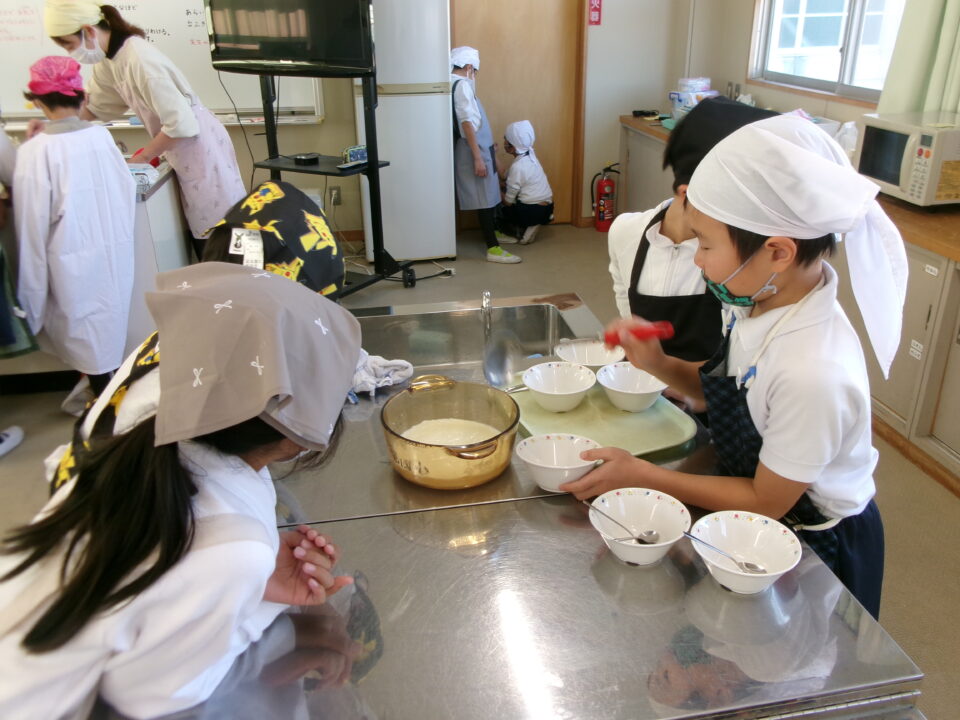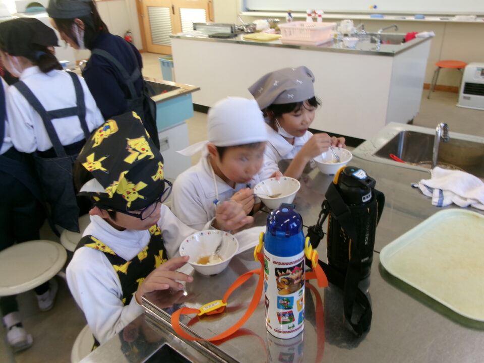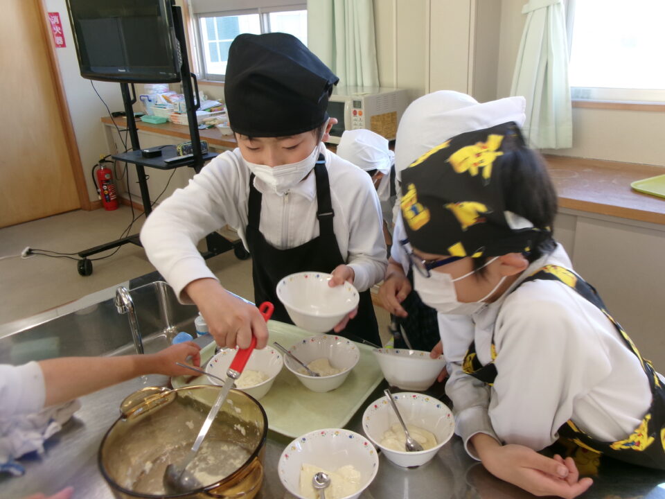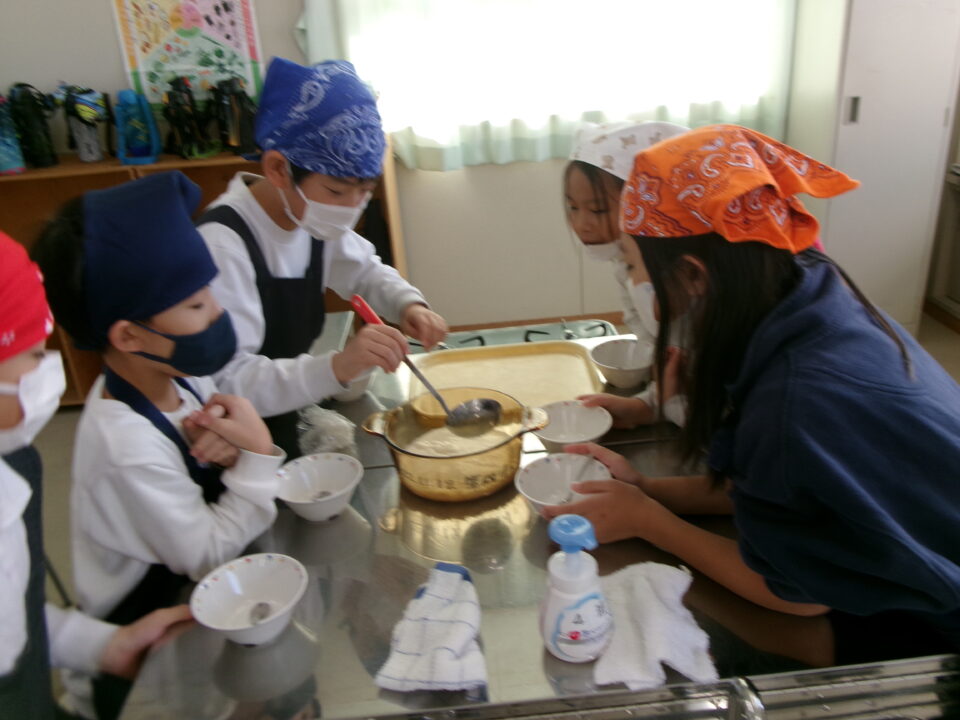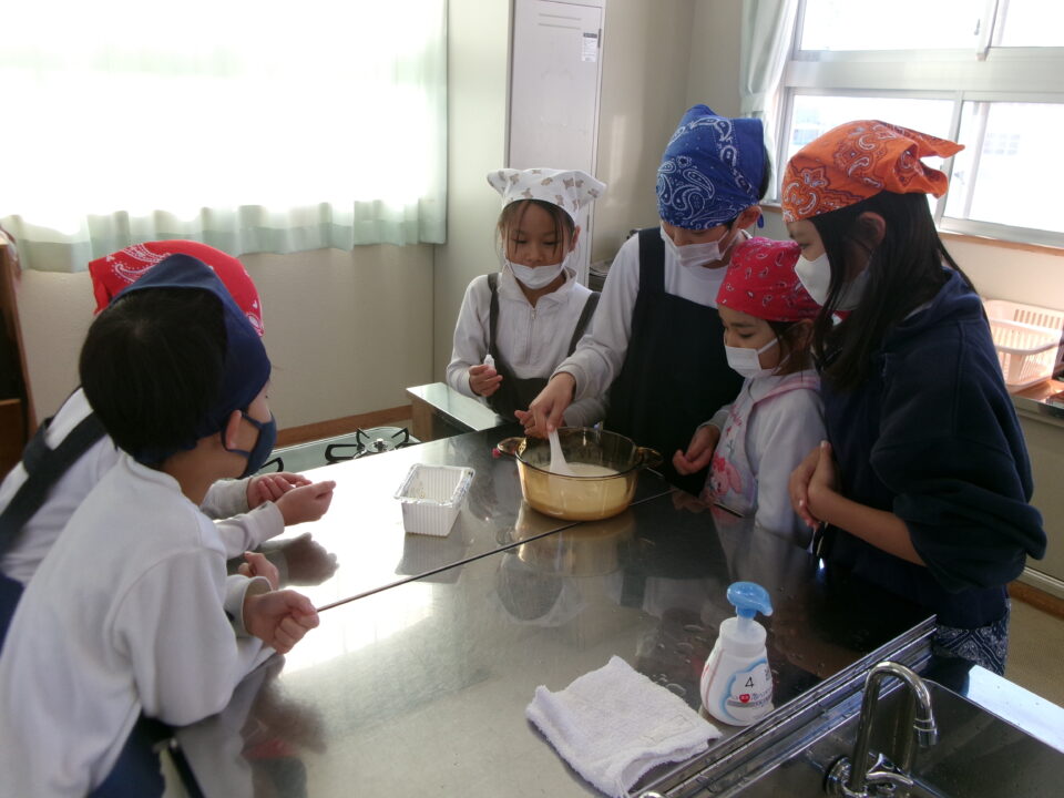 年生ねんせいどもたちは、豆乳とうにゅうからつく実習じっしゅうおこないました。豆乳とうにゅうににがりをれて電子でんしレンジであたためてつくります。これならおうちでもできそうですね。