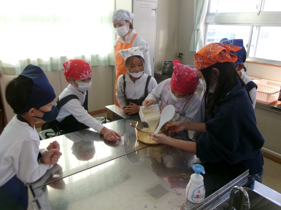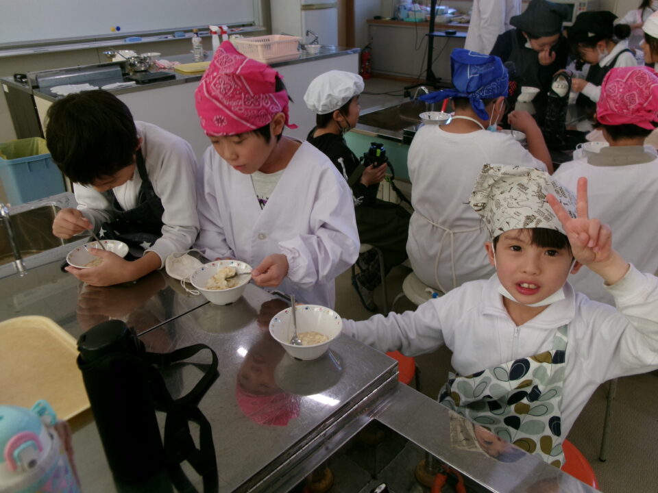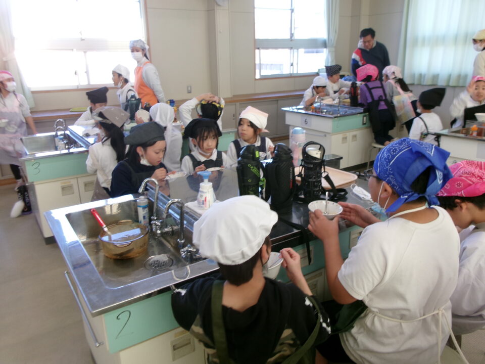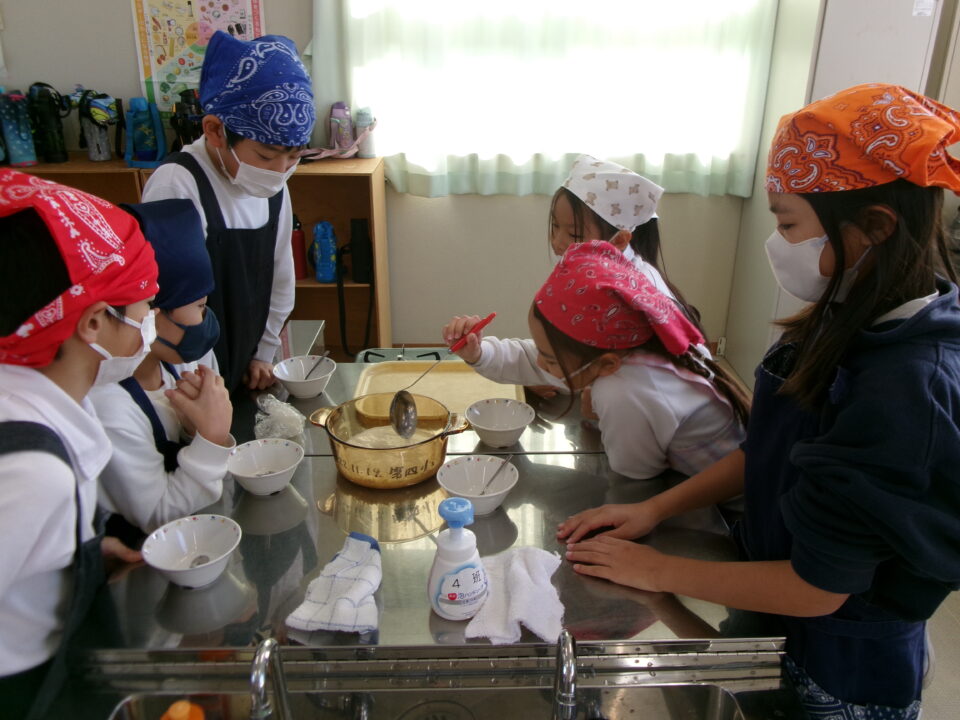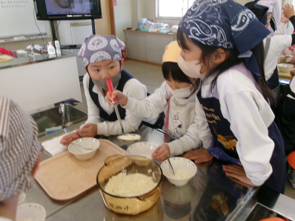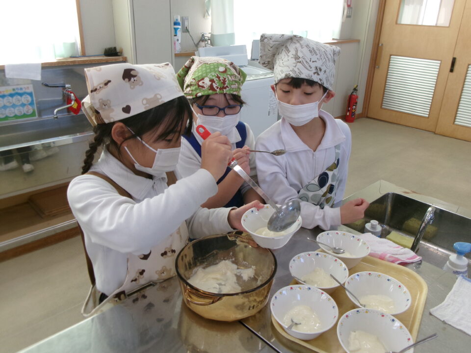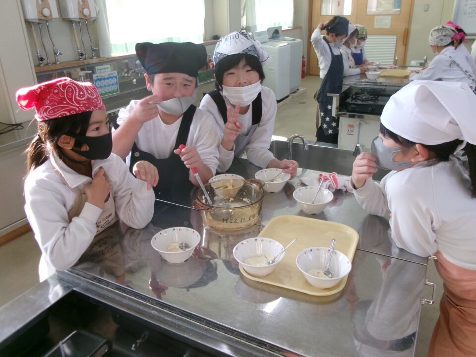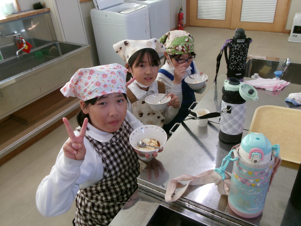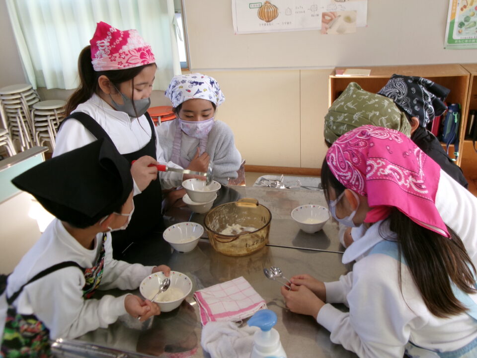 年生ねんせいどもたちは、豆乳とうにゅうからつく実習じっしゅうおこないました。豆乳とうにゅうににがりをれて電子でんしレンジであたためてつくります。これならおうちでもできそうですね。
