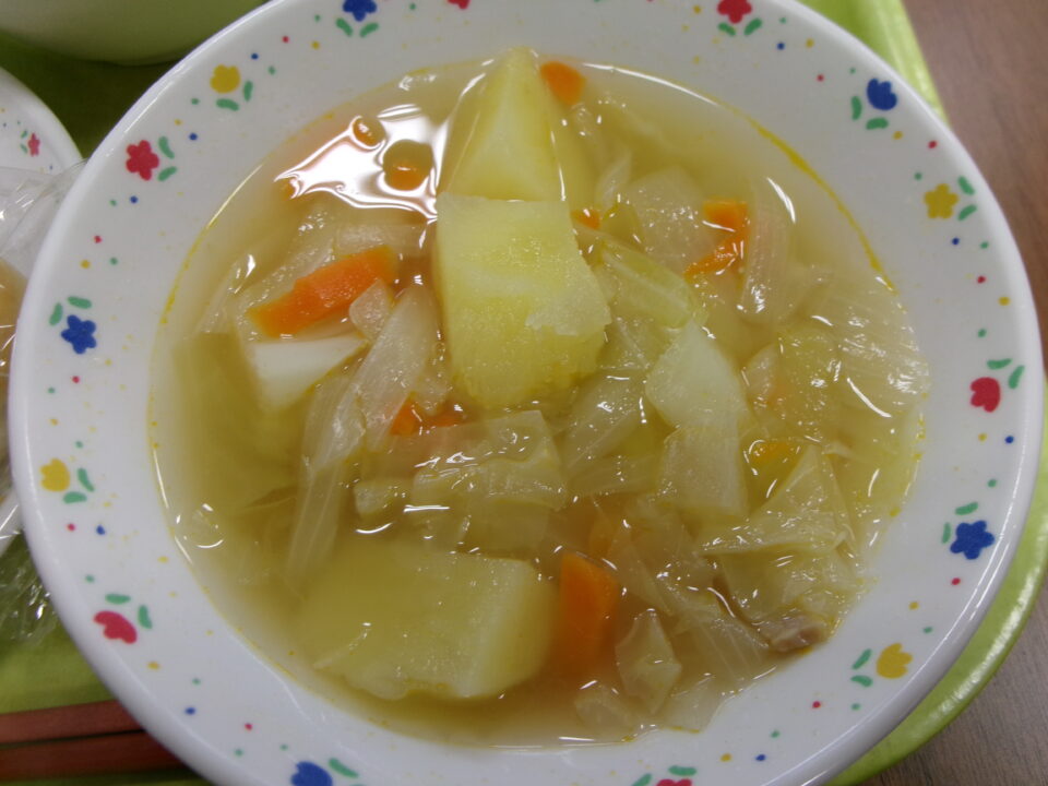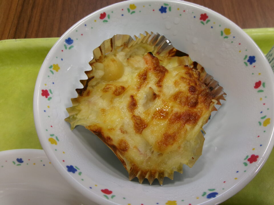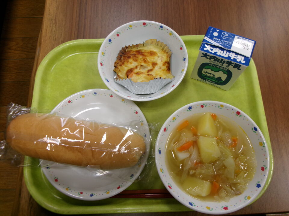 今日きょう給食きゅうしょくは、米粉入こめこいりパン、牛乳ぎゅうにゅう、マカロニグラタン、野菜やさいのスープでした。