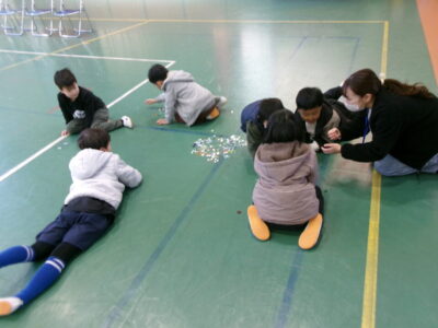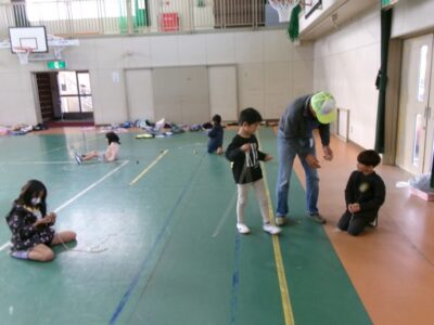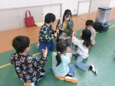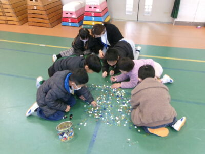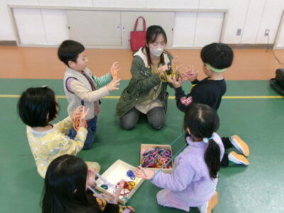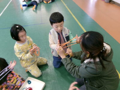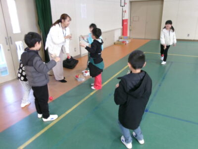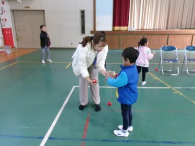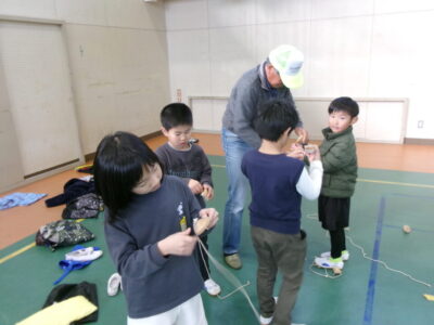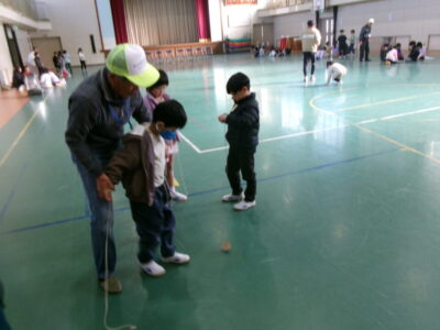 体育館では、こま回し、めんこ、あやとり、おはじき、けん玉、お手玉をしました。お手玉もなんと手作りです。