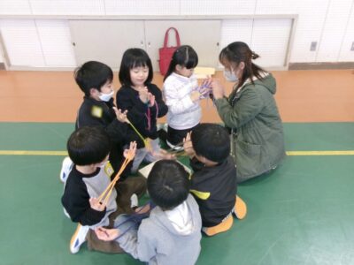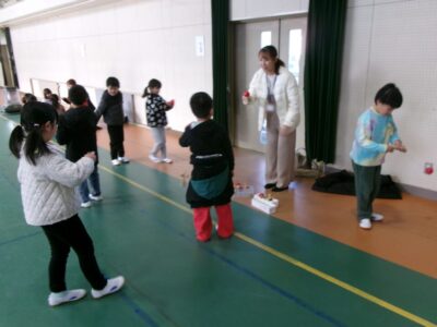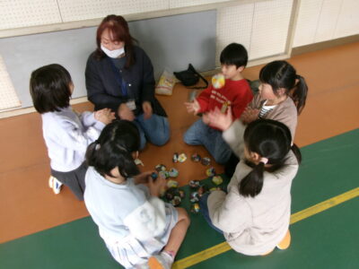 1年生の子どもたちは、時間を区切ってそれぞれのコーナーを全部回り、担当するおうえん隊の方に遊びのコツなどを教わりながら、楽しく遊ぶことができました。