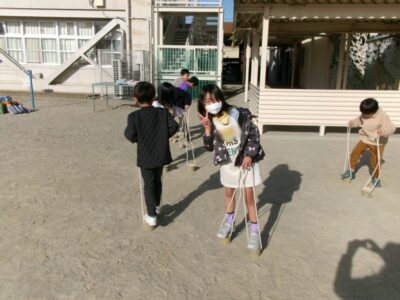 竹ぽっくりは、CSおうえん隊牧野忠男さんの手作りです。子どもたちは、とても楽しそうで笑顔いっぱいでした。