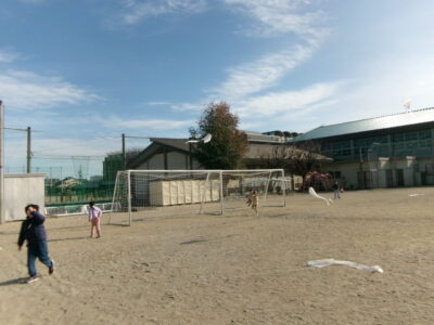 運動場では、たこあげ、竹馬、竹ぽっくりをしました。