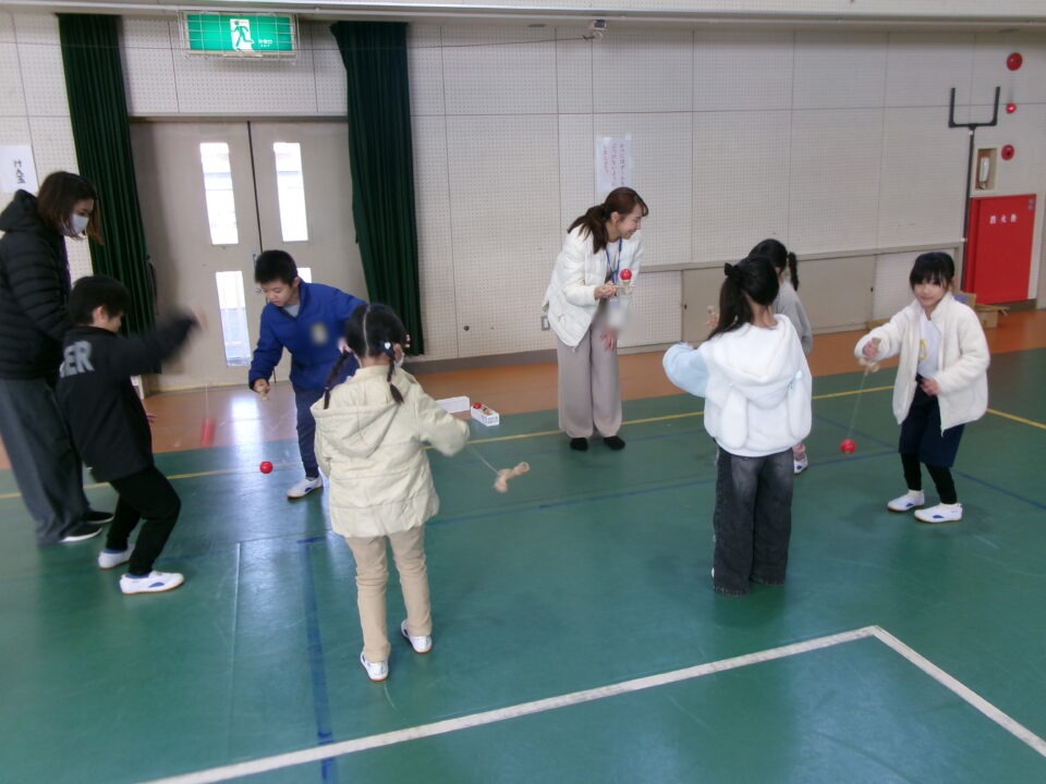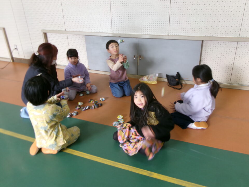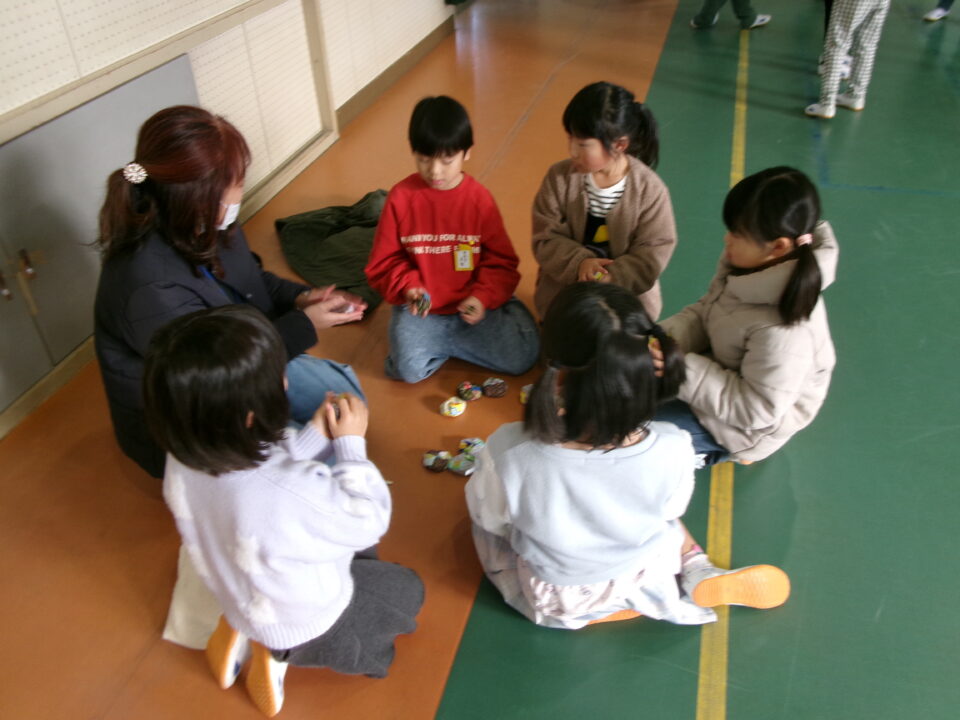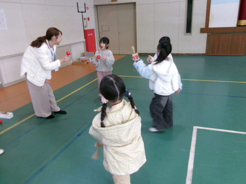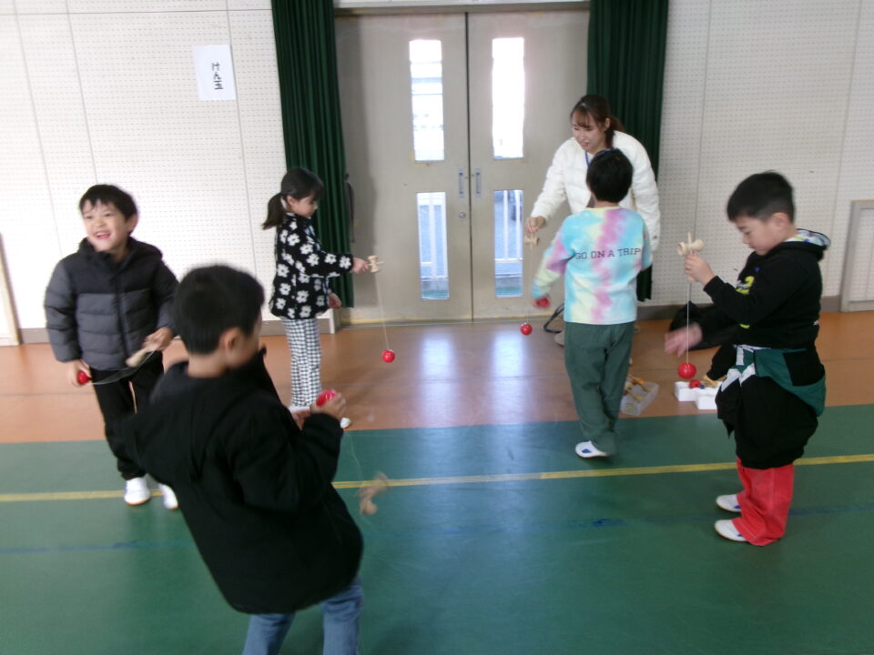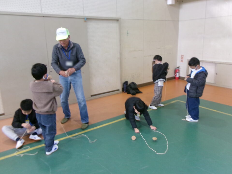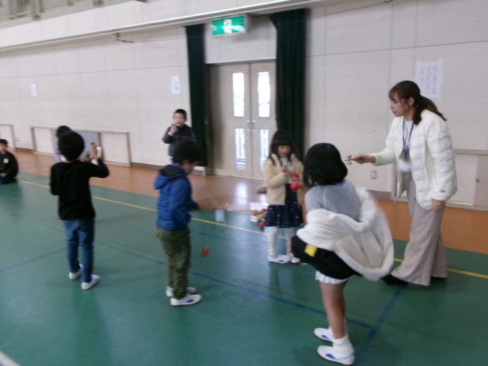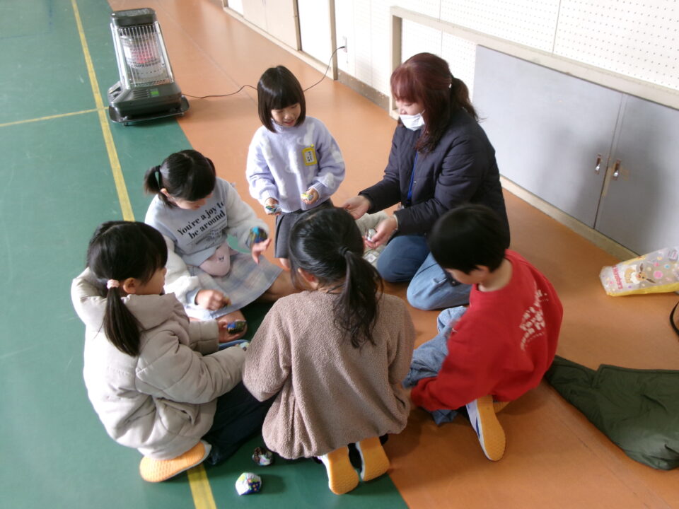 体育館では、こま回し、めんこ、あやとり、おはじき、けん玉、お手玉をしました。お手玉もなんと手作りです。