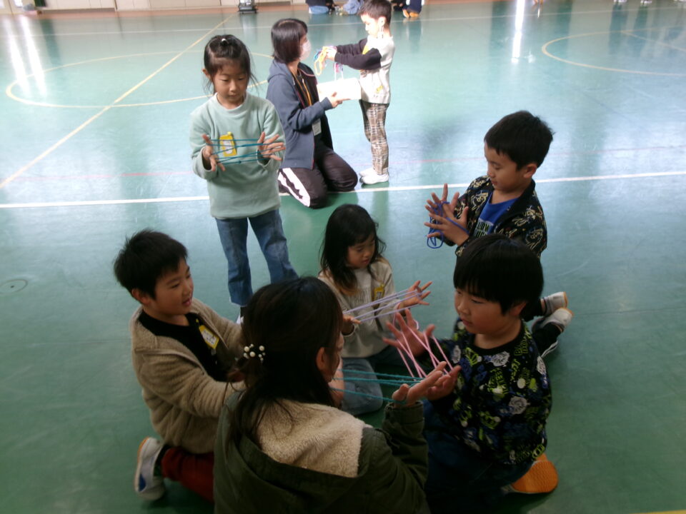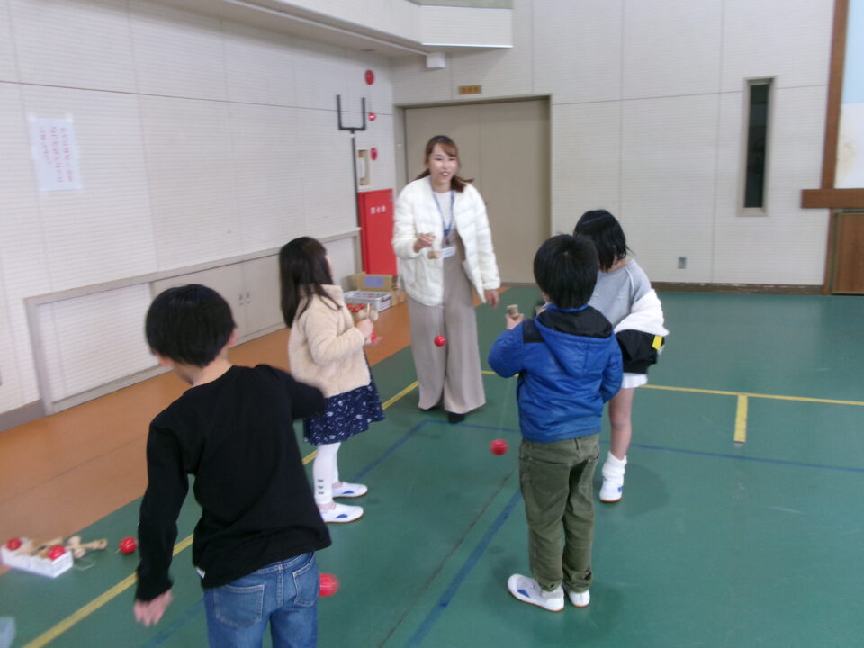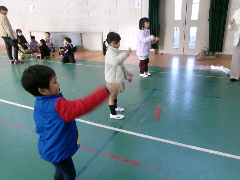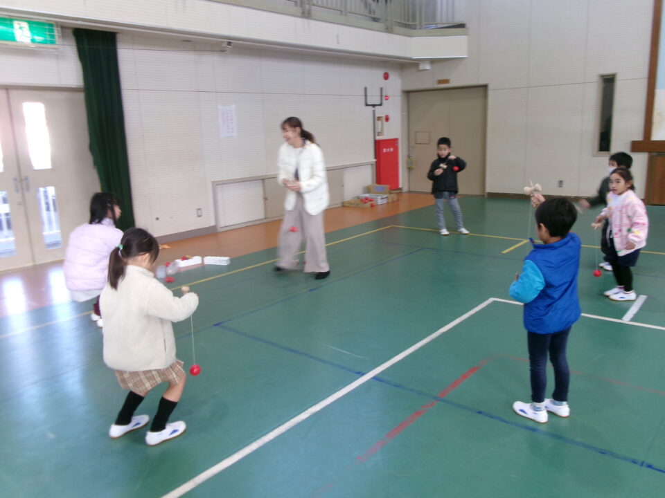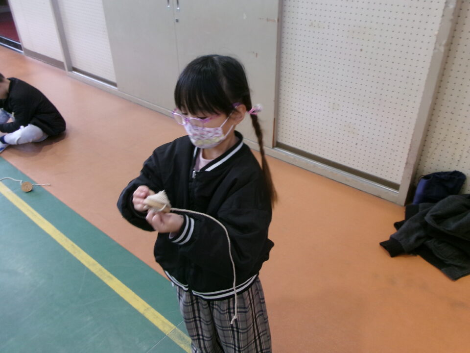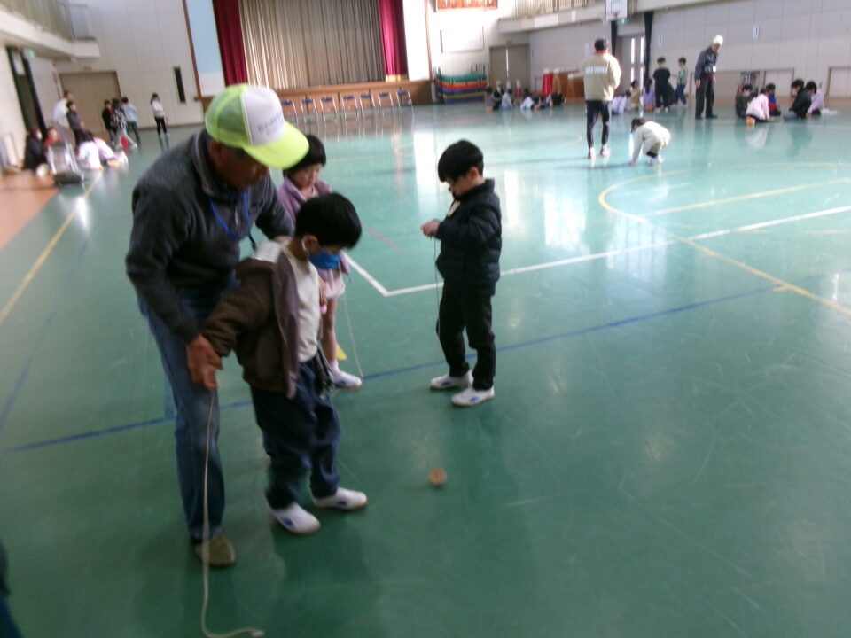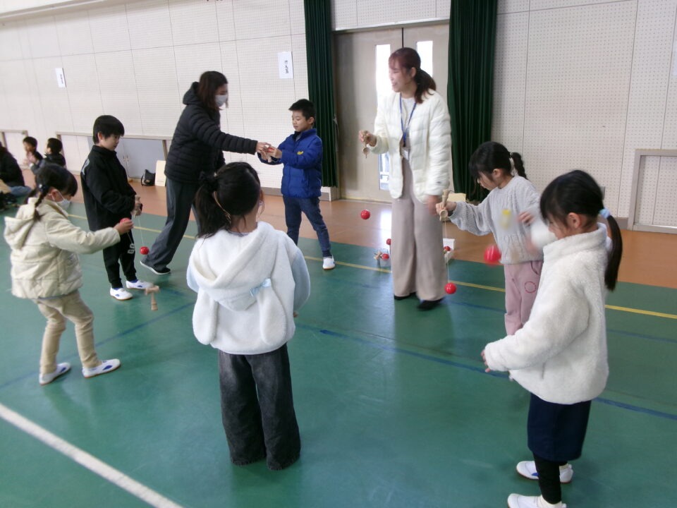 体育館では、こま回し、めんこ、あやとり、おはじき、けん玉、お手玉をしました。お手玉もなんと手作りです。