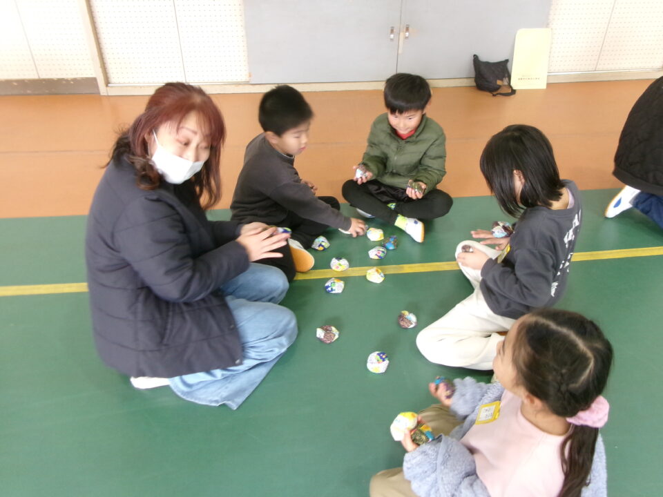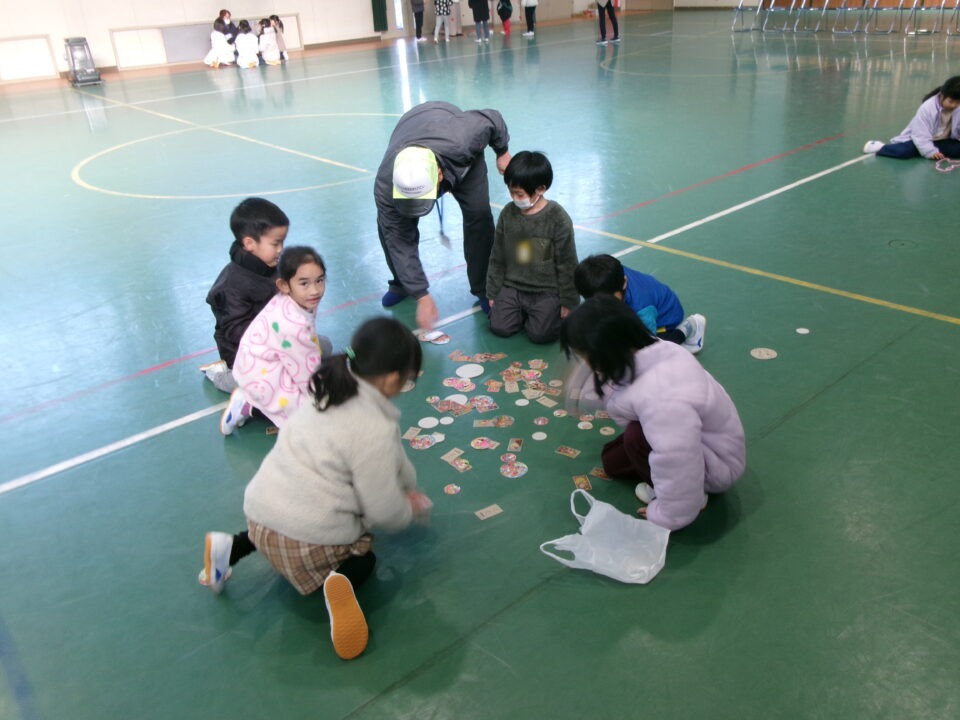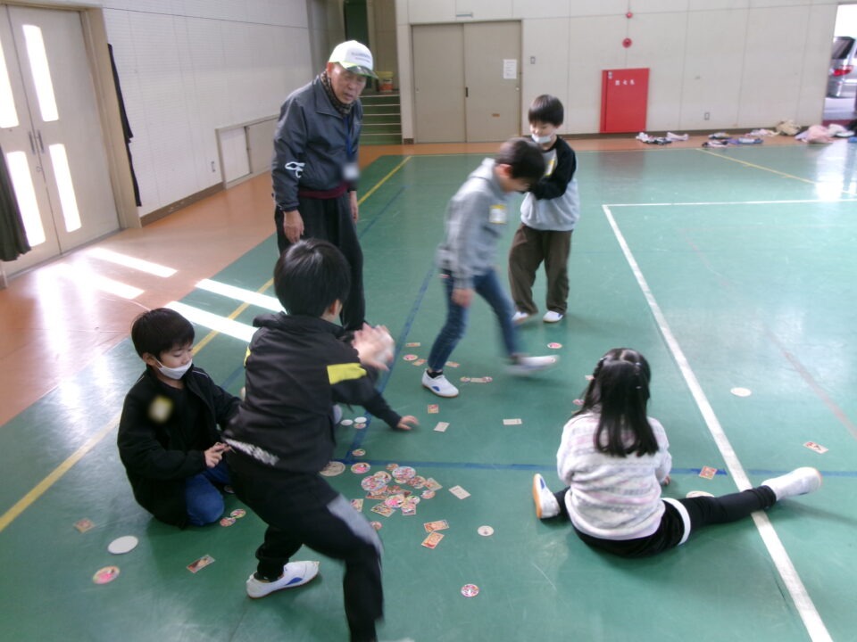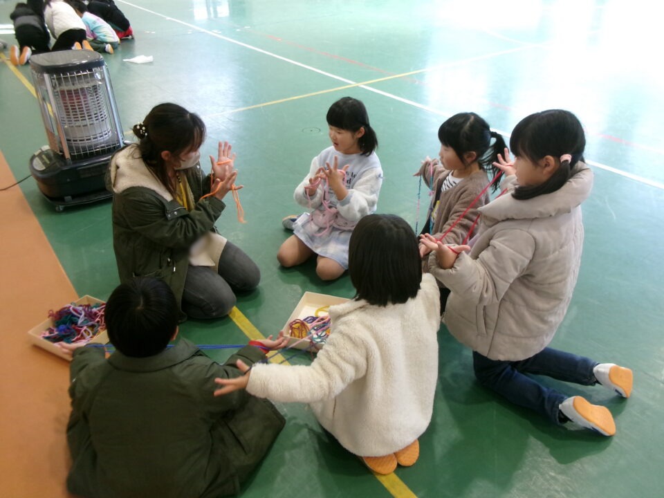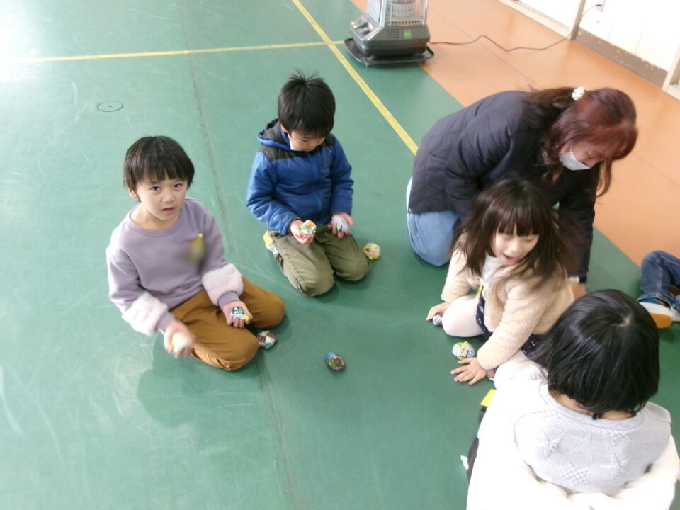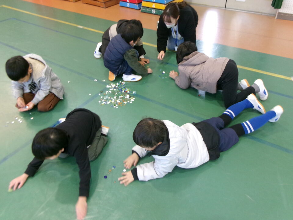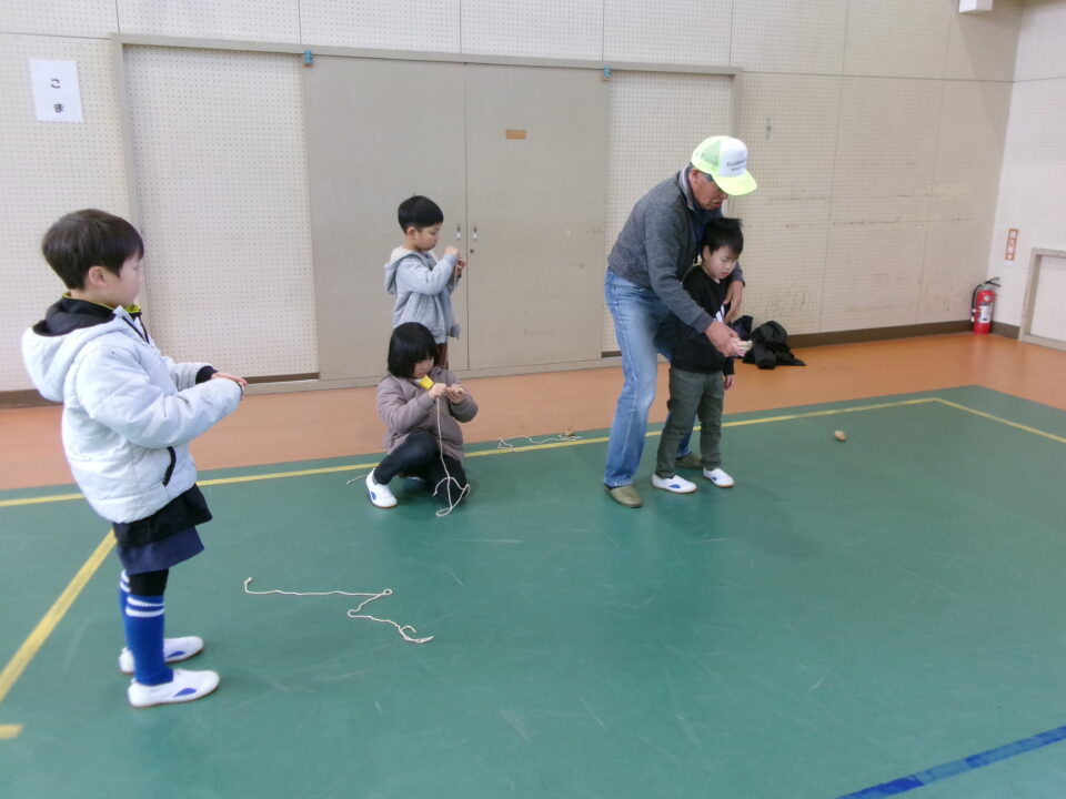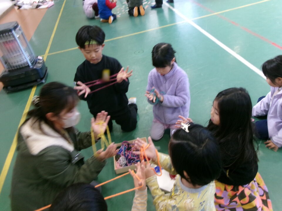 体育館では、こま回し、めんこ、あやとり、おはじき、けん玉、お手玉をしました。お手玉もなんと手作りです。