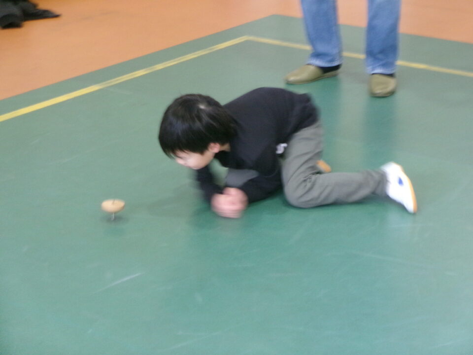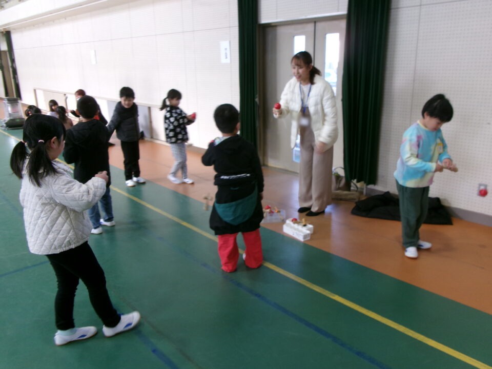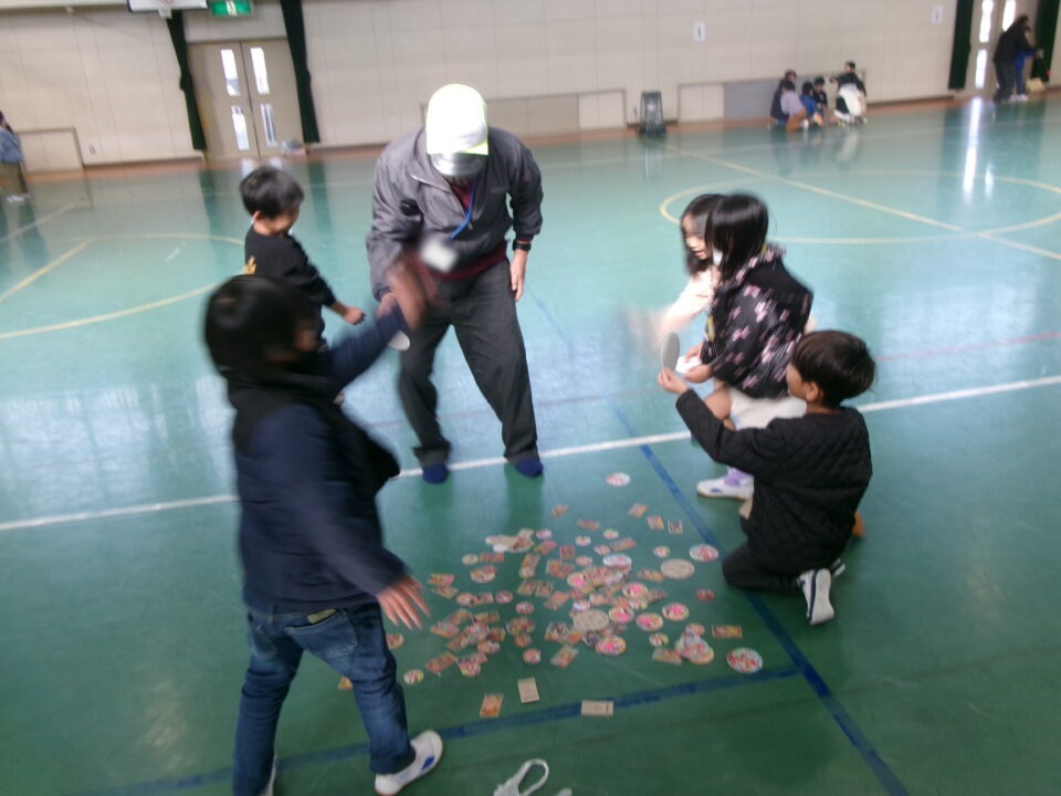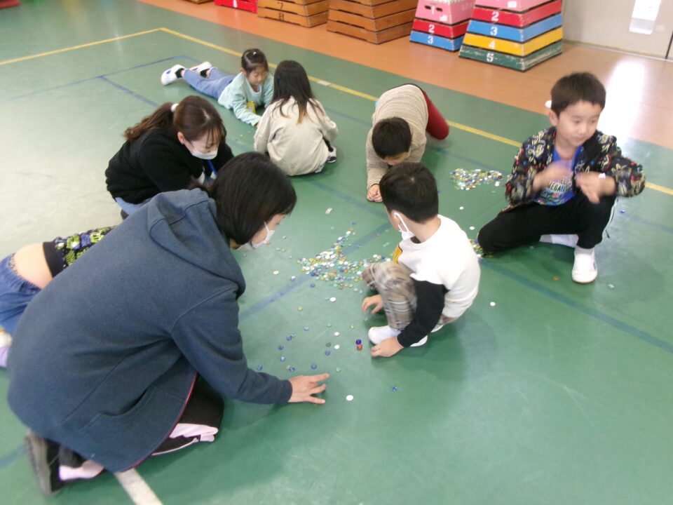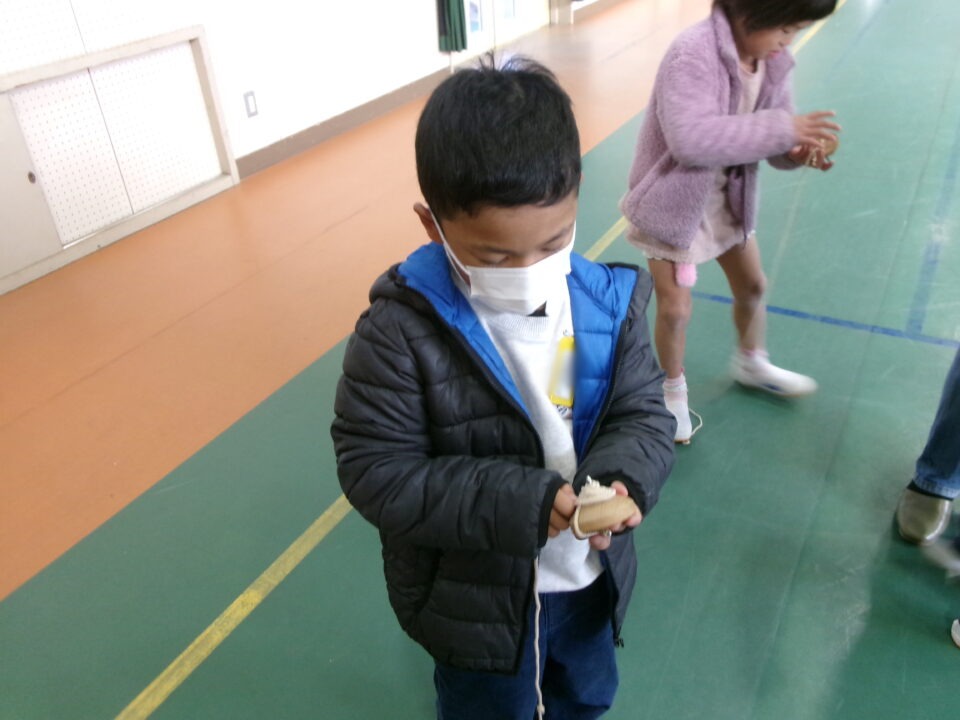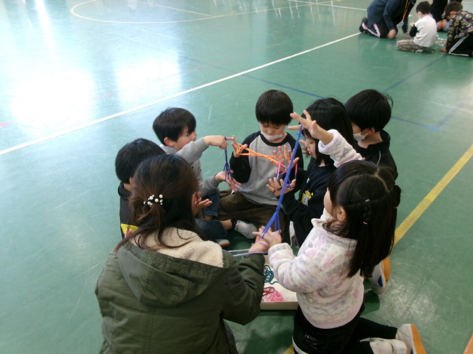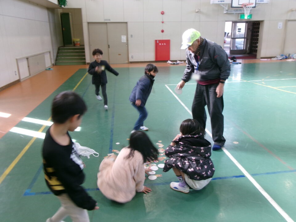 体育館では、こま回し、めんこ、あやとり、おはじき、けん玉、お手玉をしました。お手玉もなんと手作りです。