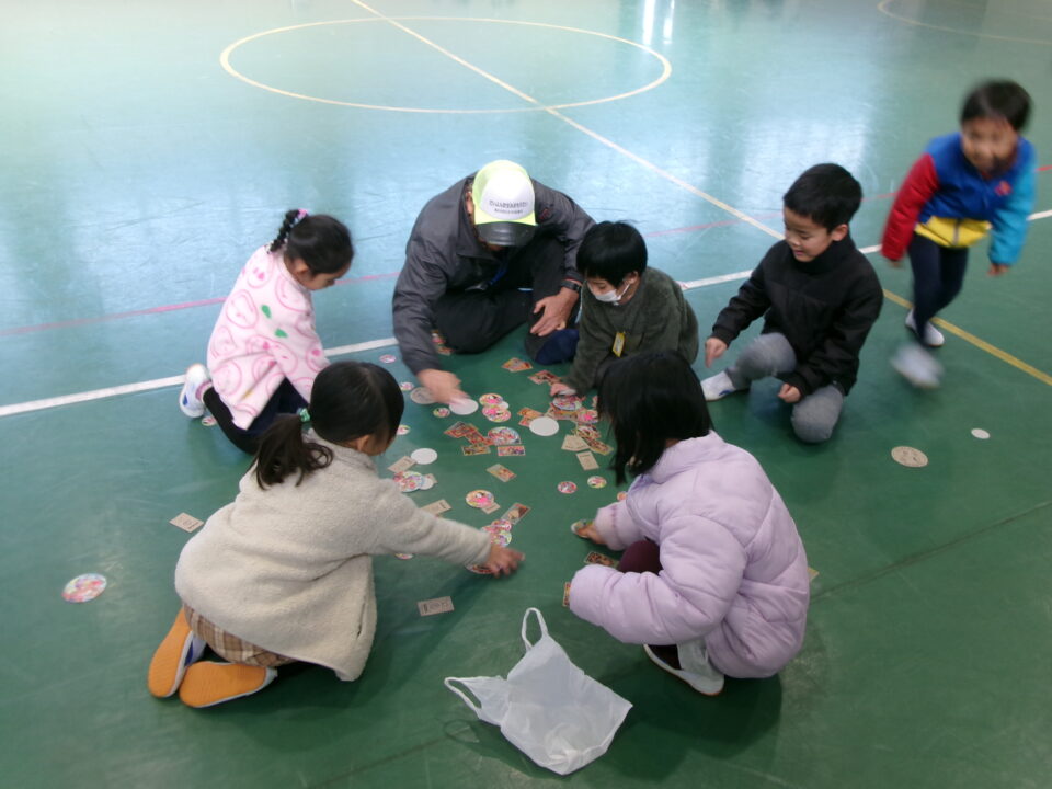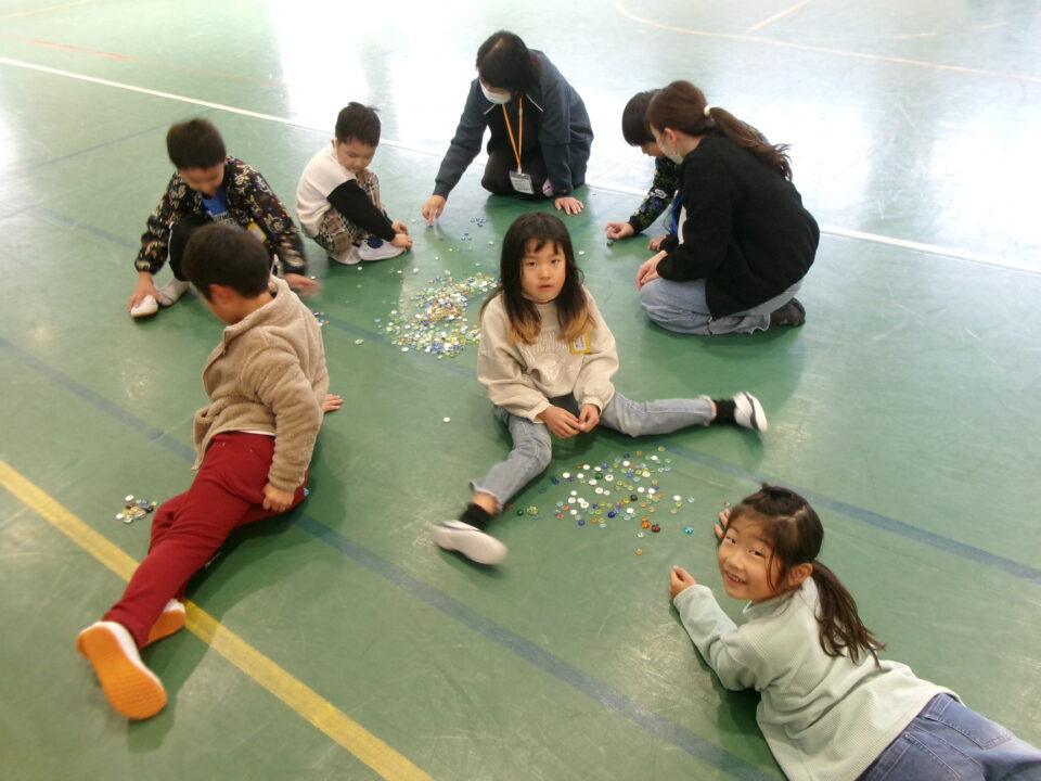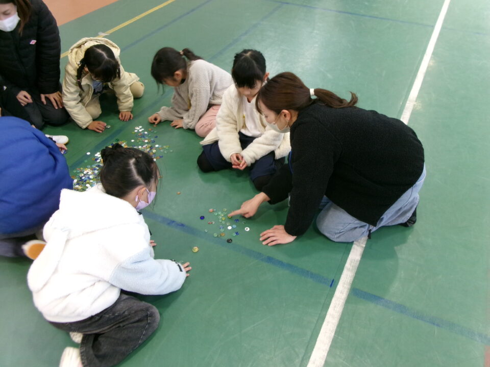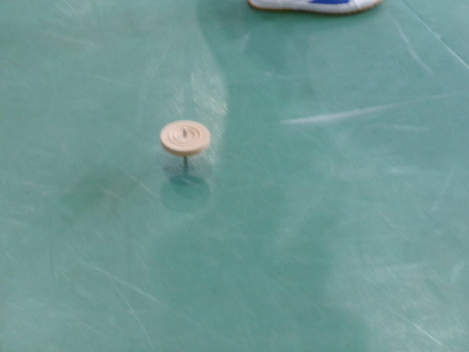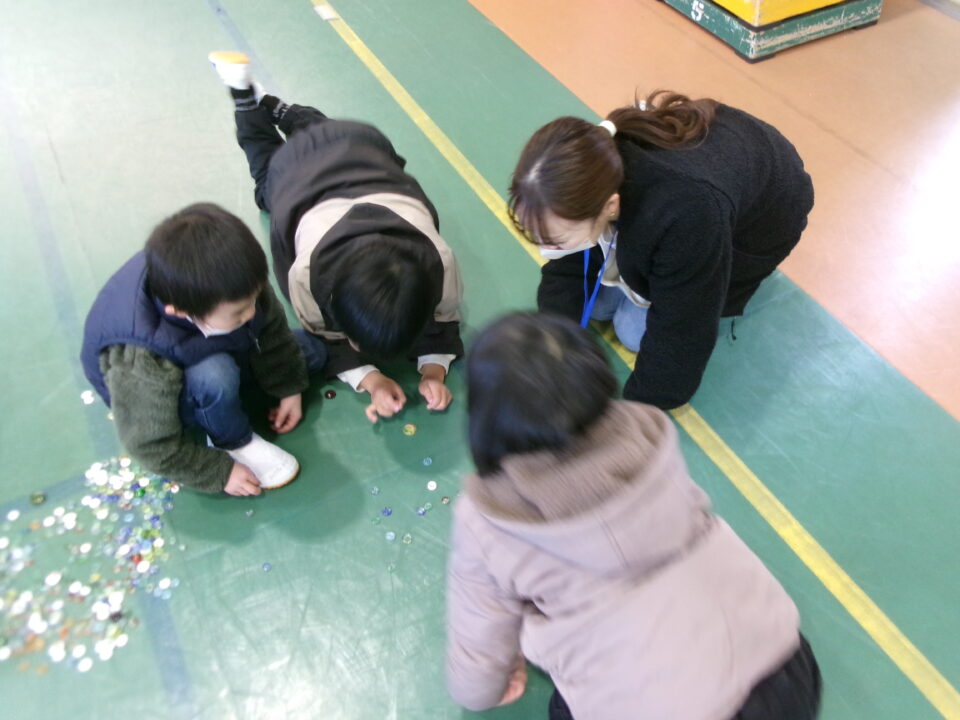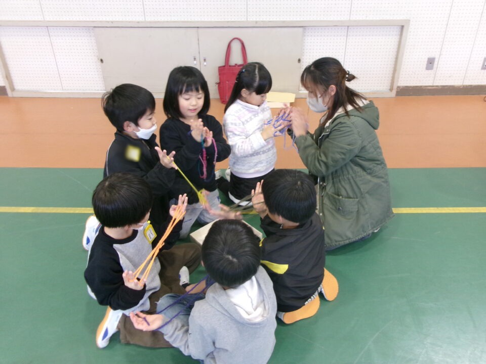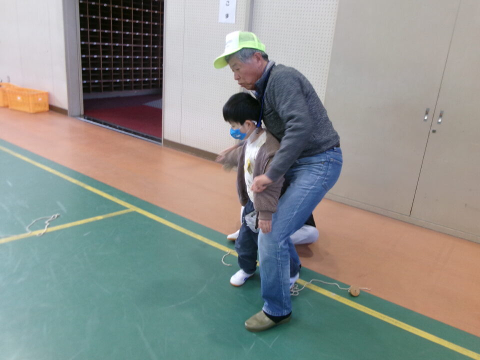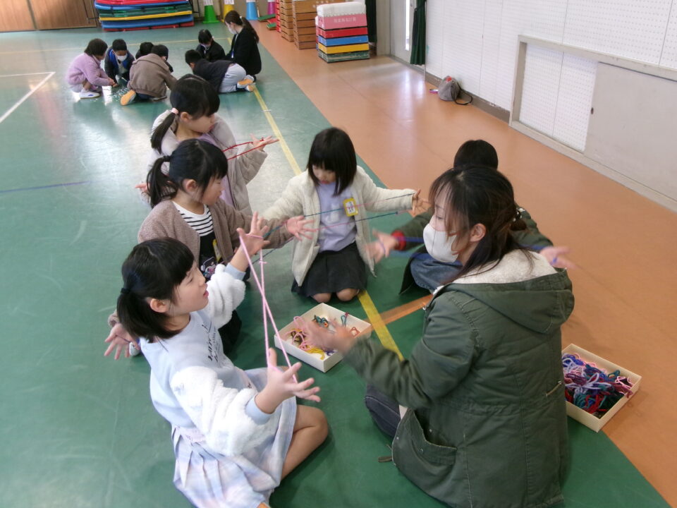 体育館では、こま回し、めんこ、あやとり、おはじき、けん玉、お手玉をしました。お手玉もなんと手作りです。
