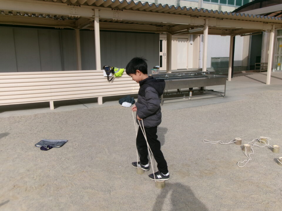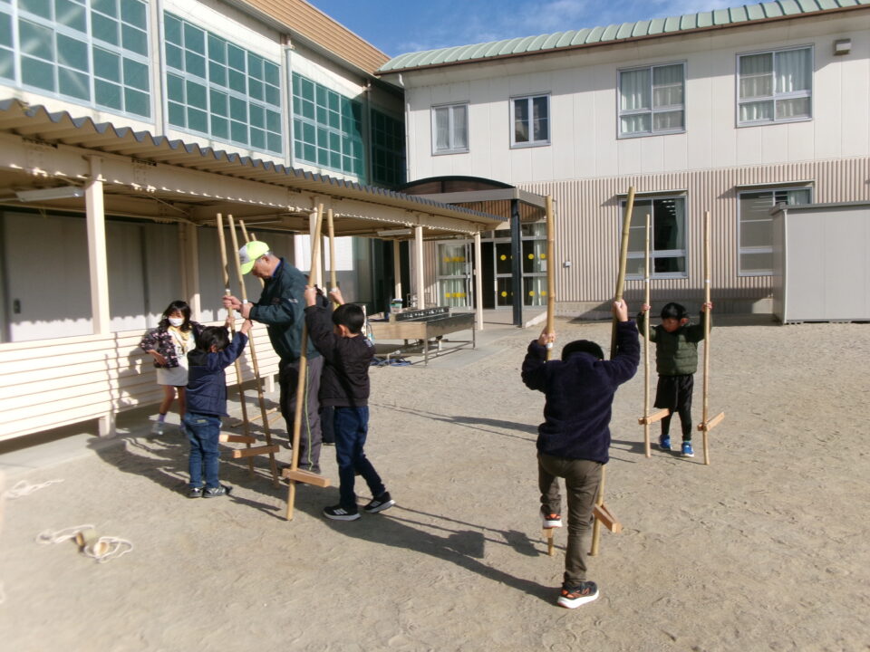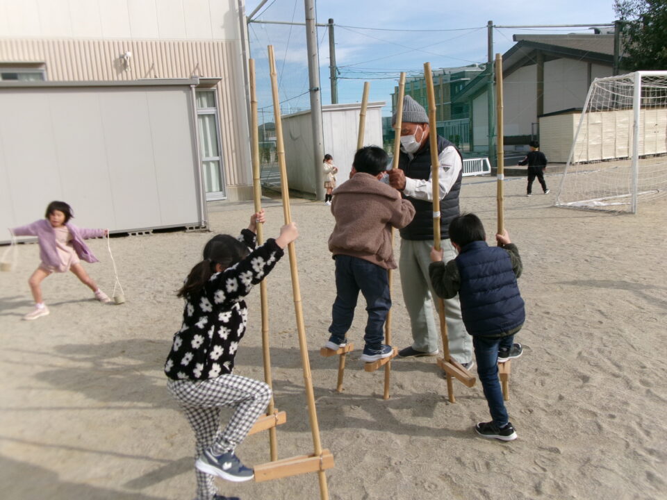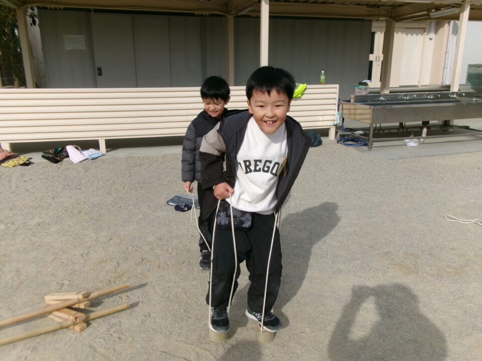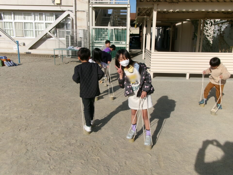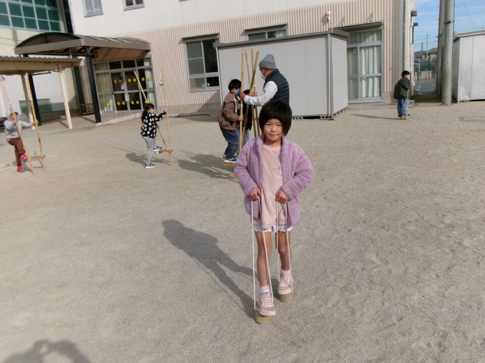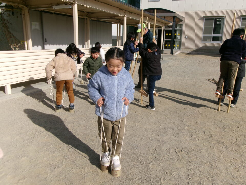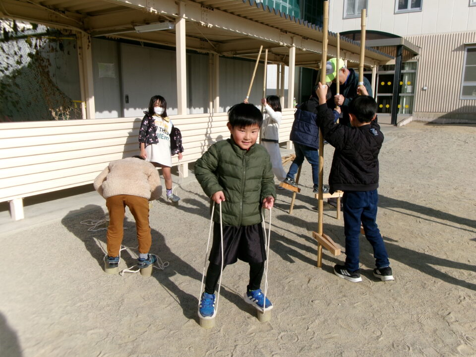 運動場では、たこあげ、竹馬、竹ぽっくりをしました。