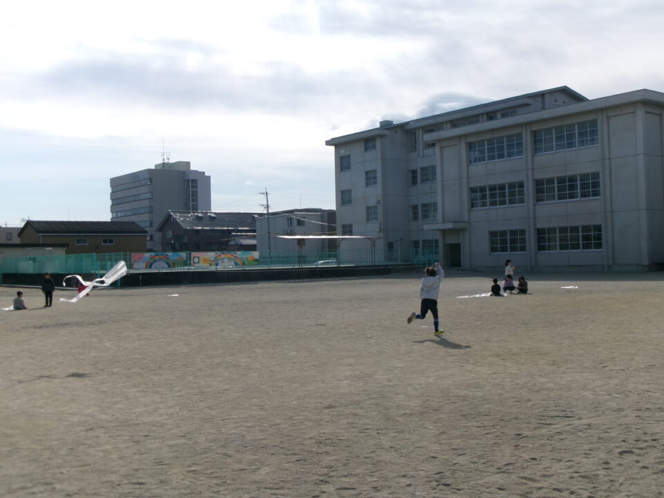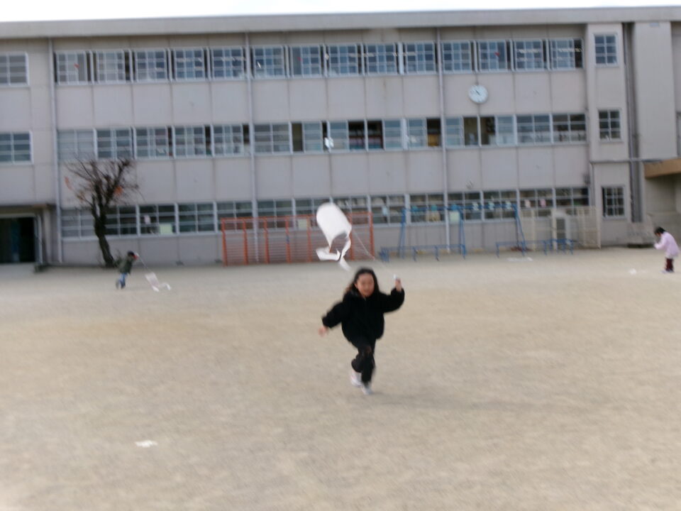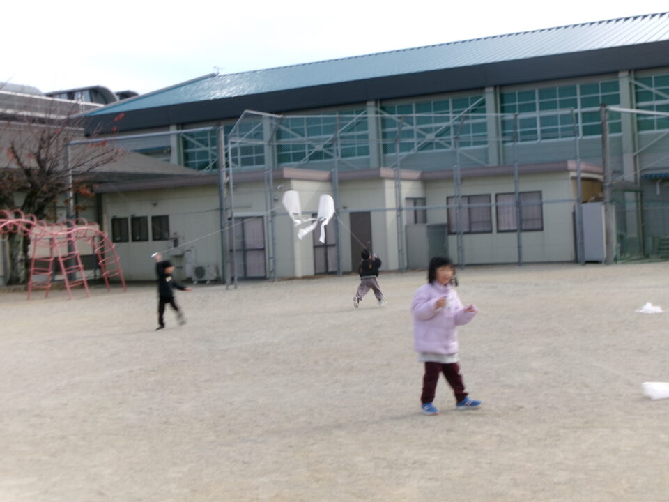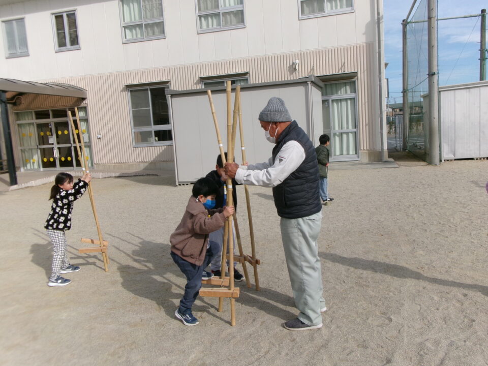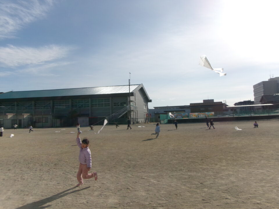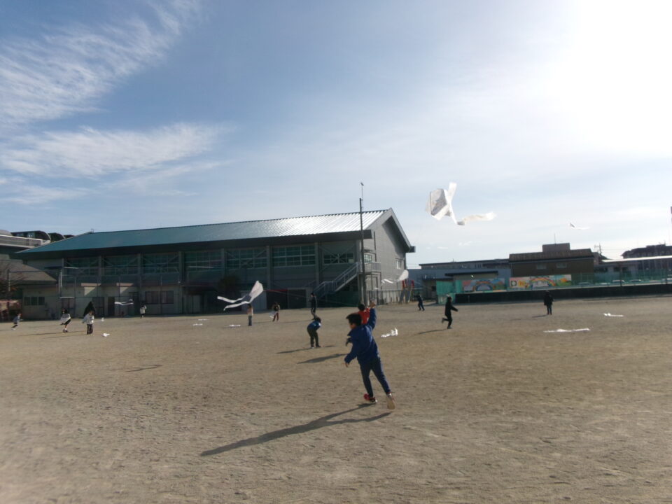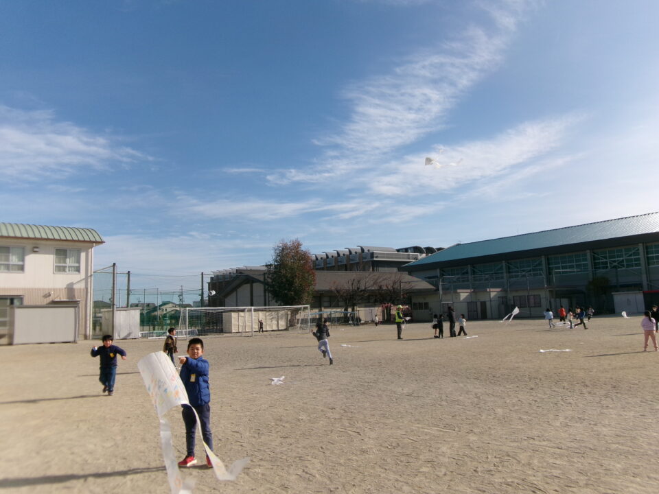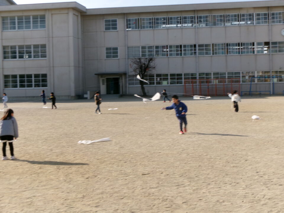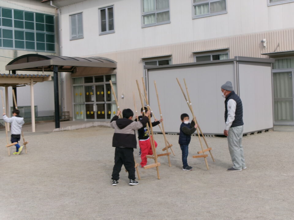 運動場では、たこあげ、竹馬、竹ぽっくりをしました。