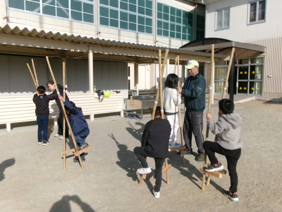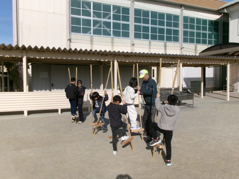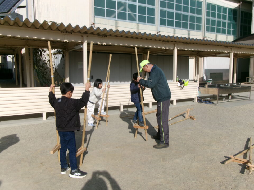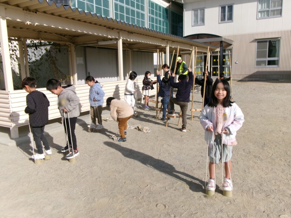 竹ぽっくりは、CSおうえん隊牧野忠男さんの手作りです。子どもたちは、とても楽しそうで笑顔いっぱいでした。