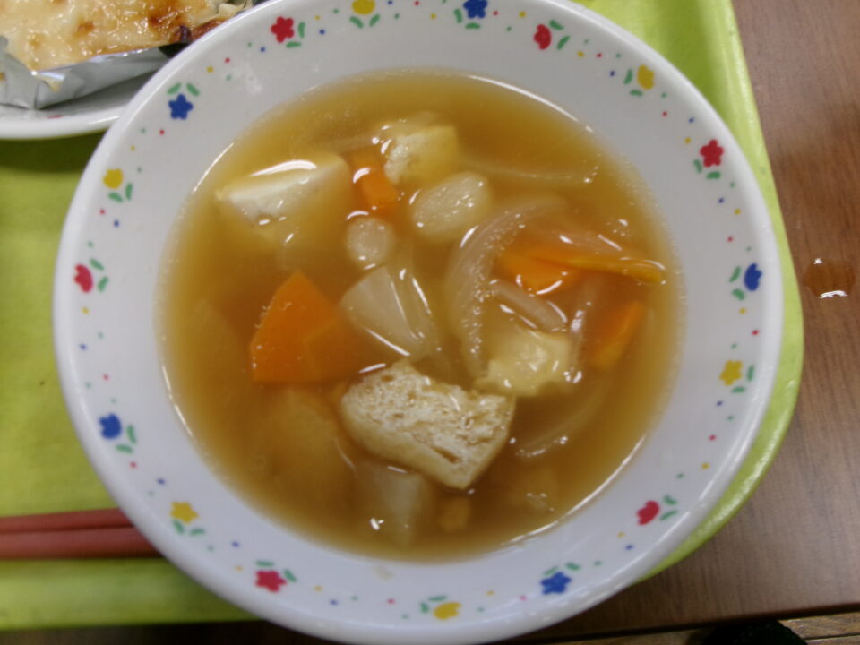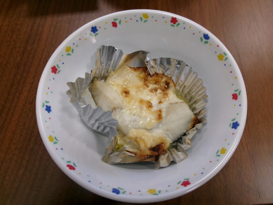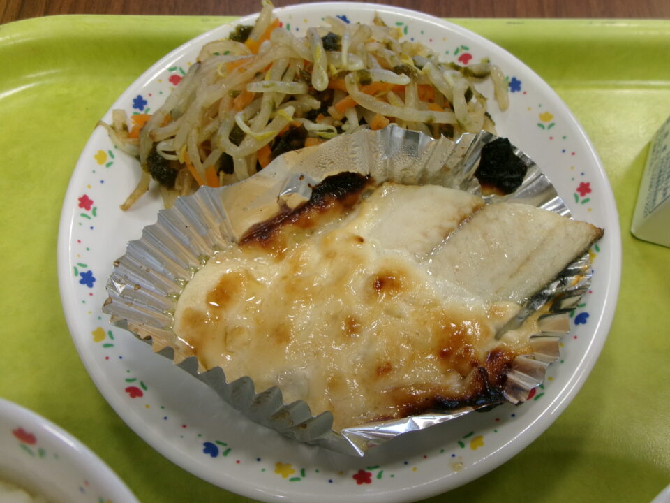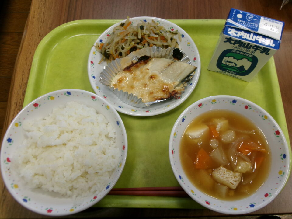 今日の給食は、ご飯、牛乳、さわらのみそマヨネーズ焼き、もやしのいそ和え、みぞれ汁でした。
