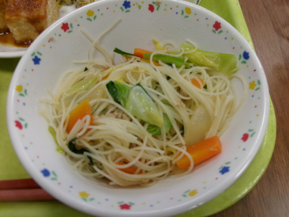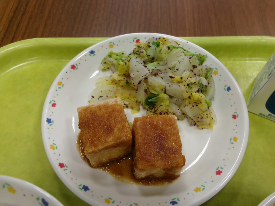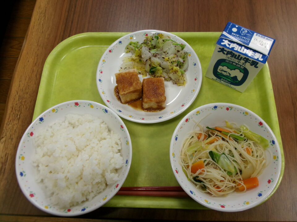 今日の給食は、ご飯、牛乳、厚揚げのごまだれがけ、白菜のしそ和え、五目ビーフン炒めでした。