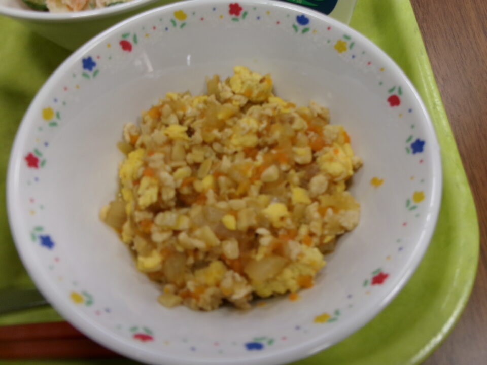 今日きょう給食きゅうしょくは、ごはん、とりそぼろ、牛乳ぎゅうにゅう、ポテトサラダでした。