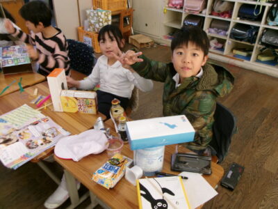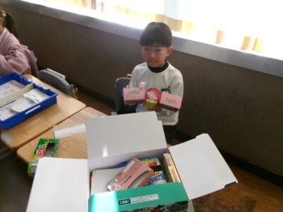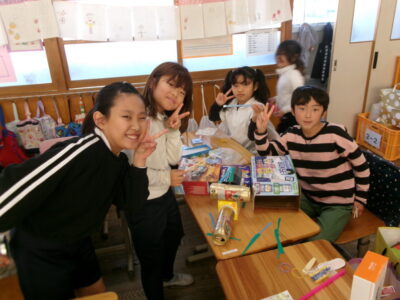 図工では、家から持ってきたもので音の出るおもちゃ作りをしていました。飾りもつけて持ち帰ってもらうようです。